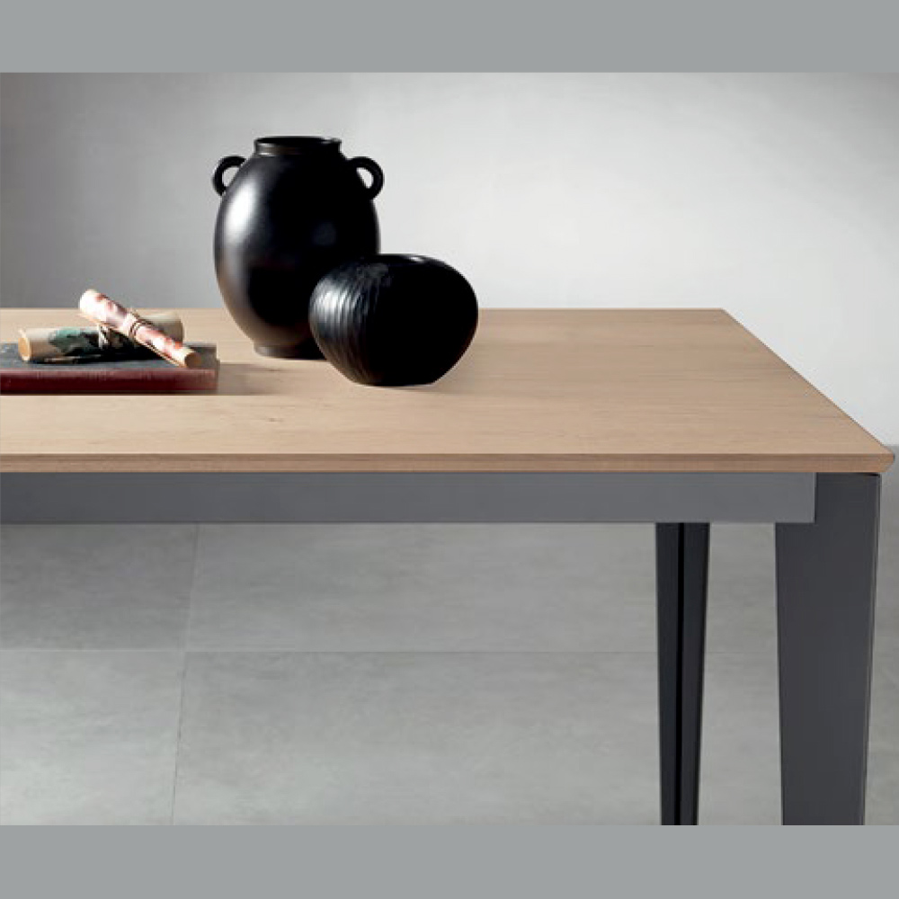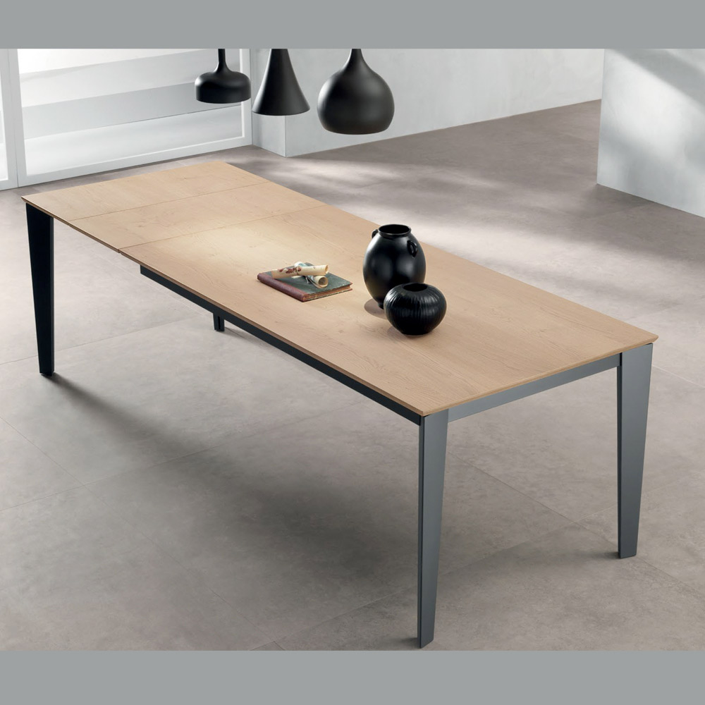 Dette elegante og funktionelle rektangulære udtræksbord kombinerer moderne design og praktisk anvendelighed. Den 22 mm tykke bordplade i naturlig egetræsfiner fremhæver træets varme, autentiske åremønster, mens de antracitmalede metalben giver stabilitet og et moderne præg.