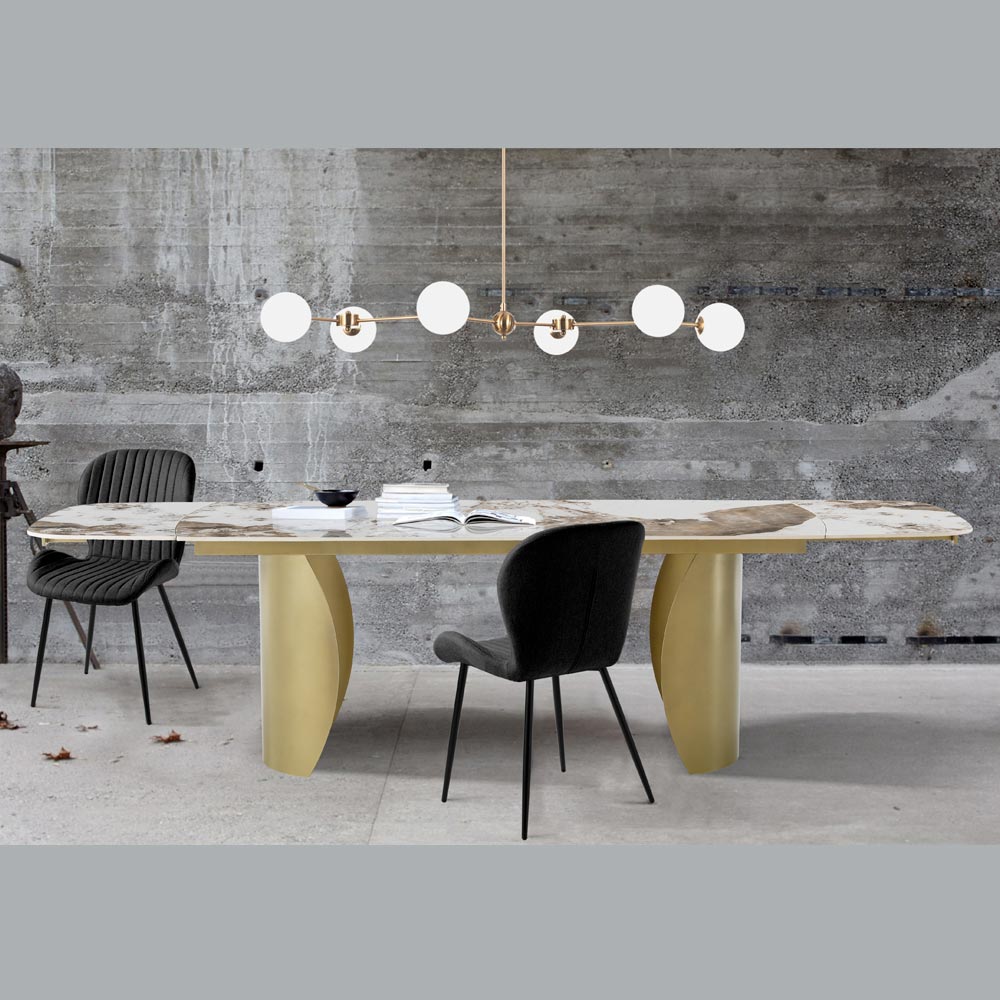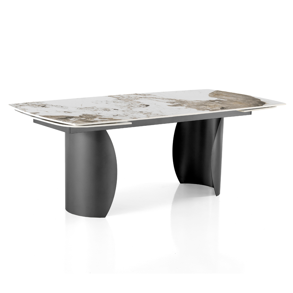 Dette udtræksbord er et sublimt udtryk for luksus og funktionalitet . Den keramiske top med marmoreffekt, karakteriseret ved indviklede flerfarvede årer, hviler på en dobbelt base, som ikke kun giver stabilitet, men tilføjer et strejf af sofistikeret elegance .