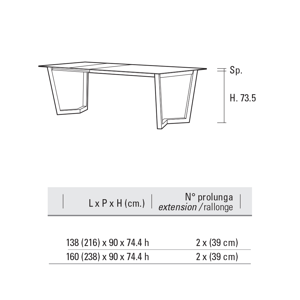 lavet af samme materiale som toppen, giver de mulighed for at dette møbel kan strække sig op til en maksimal længde på 238 cm, hvilket skaber