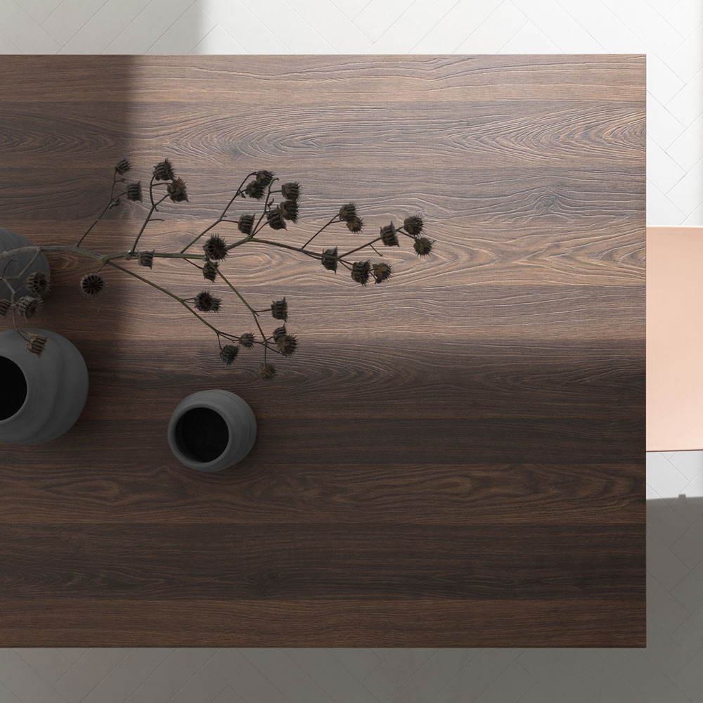 NB : bunden og bordpladen fås i en lang række forskellige finish. Kontinuiteten af kornet mellem toppen og forlængelsen er ikke garanteret