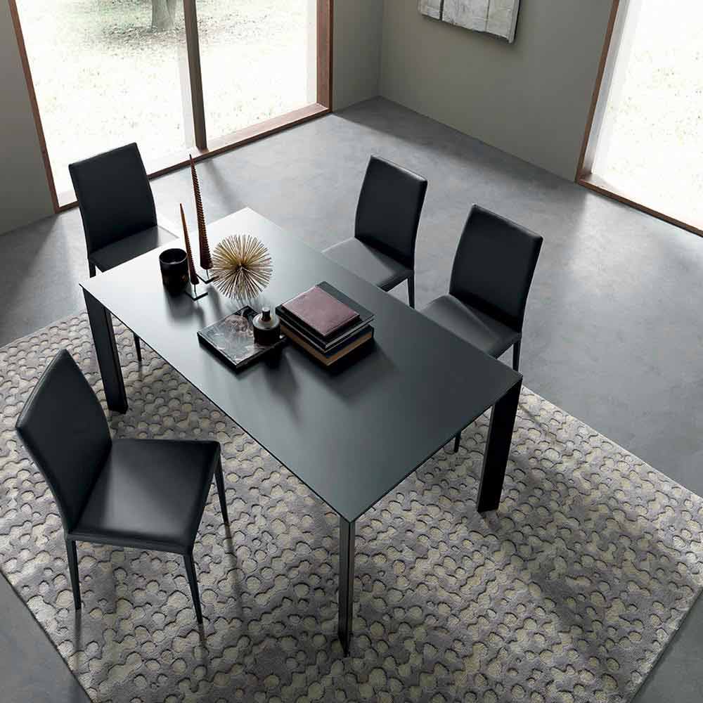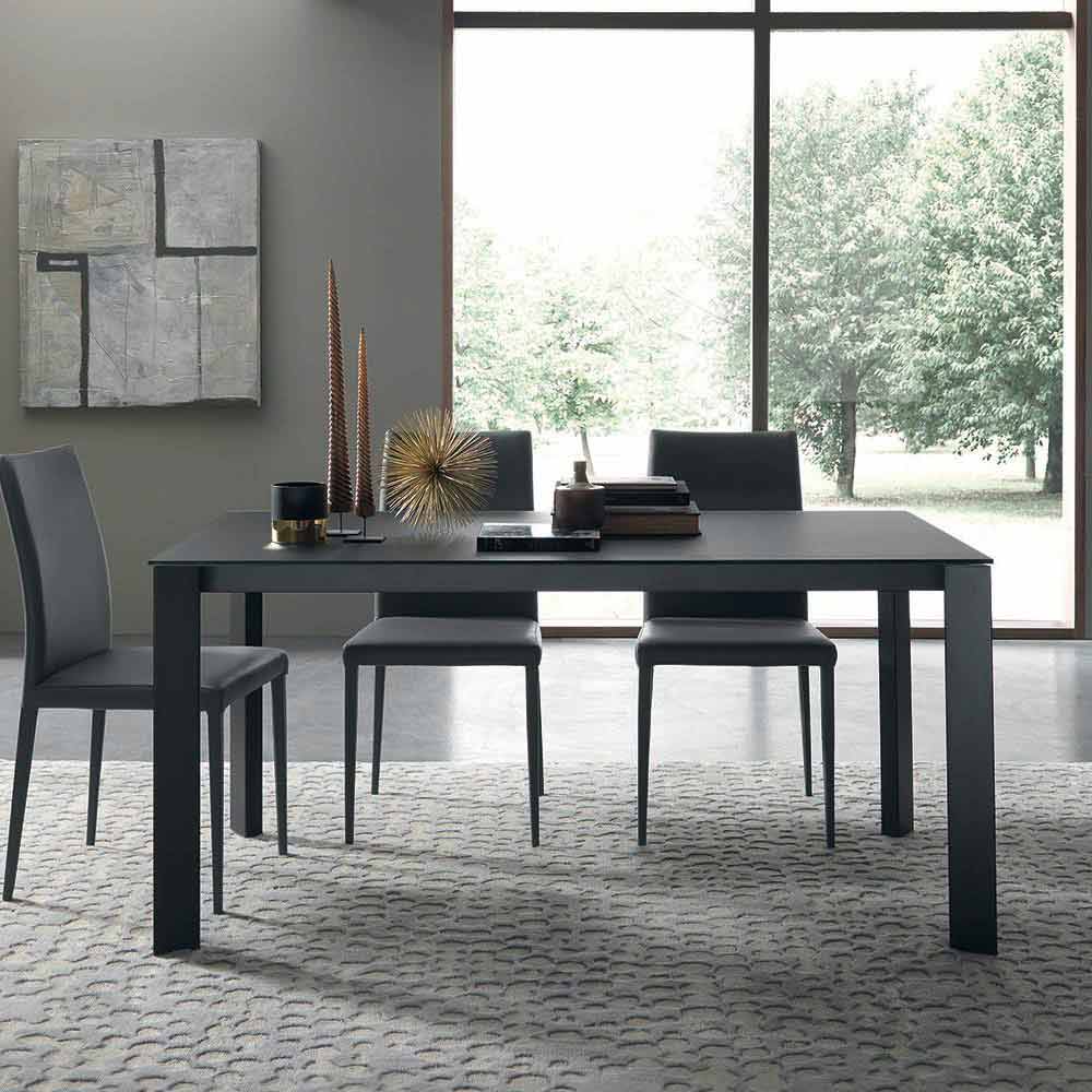 Moderne udtrækkeligt spisebord med glasplade og metalben Made in Italy.