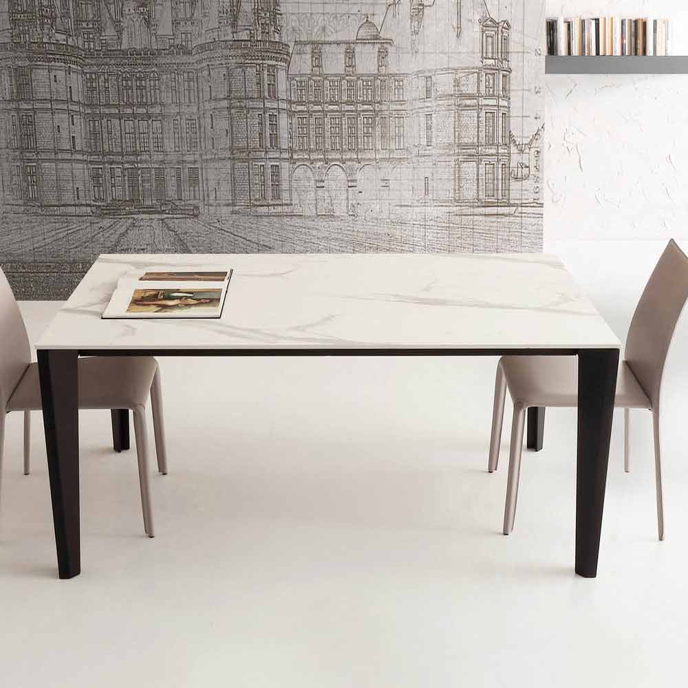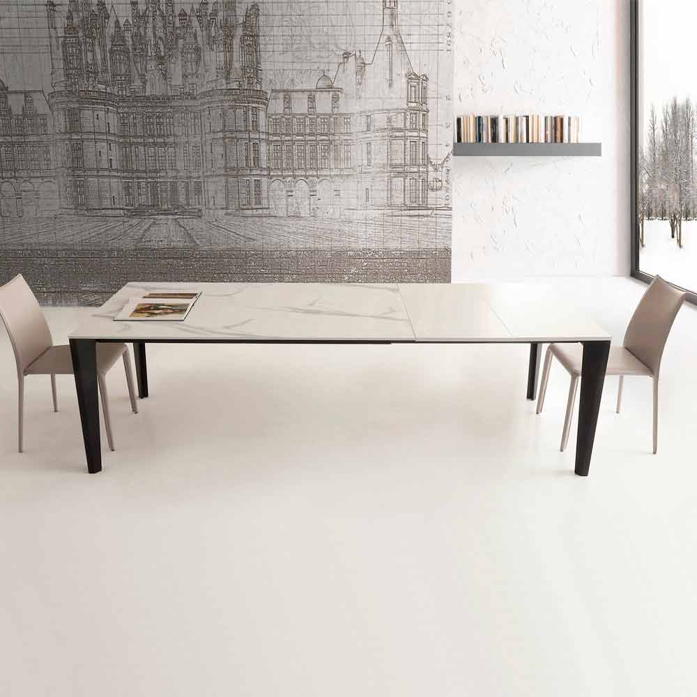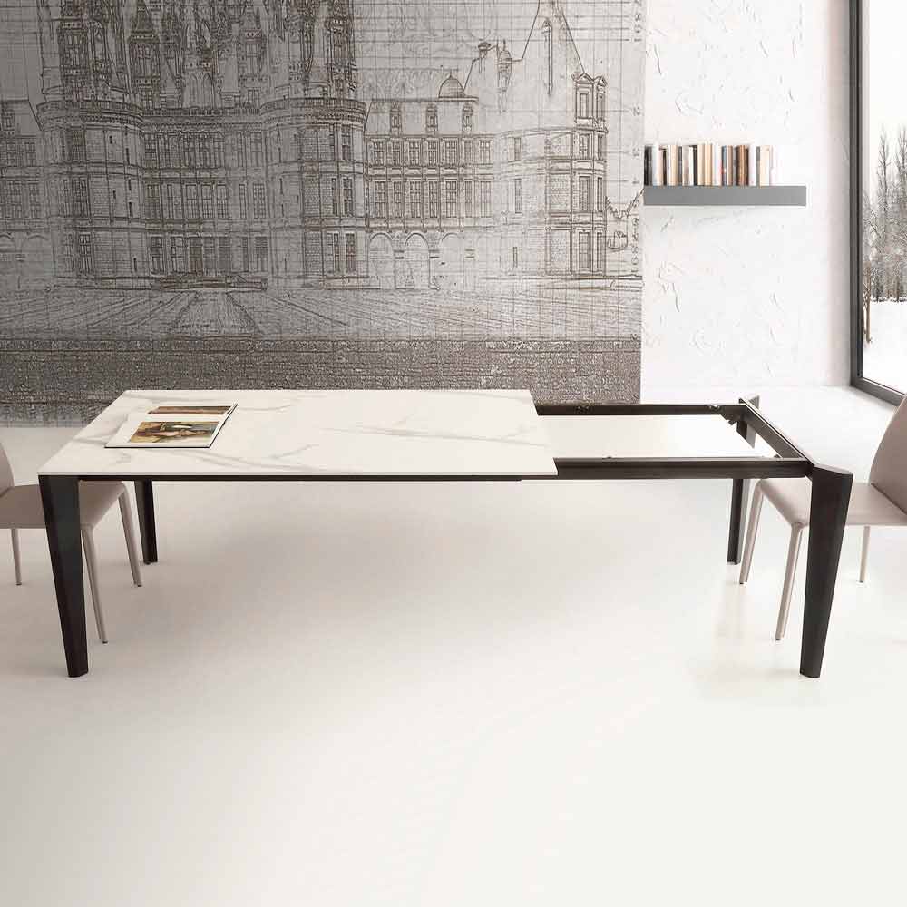 Spisebord fremstillet i Italien med udvidelig glaskeramikplade (12 mm tyk) med Calacatta hvid marmoreffekt, hvid melaminforlænger og sortlakeret metalbase .