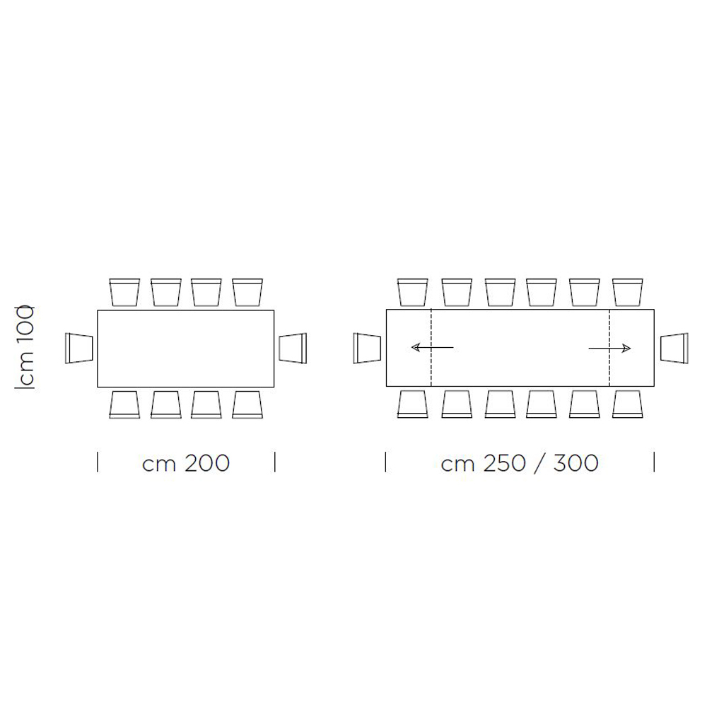 - L 200/300 x D 100 x H 75,5 cm 14 sæder (2 udtræk á 50 cm).
