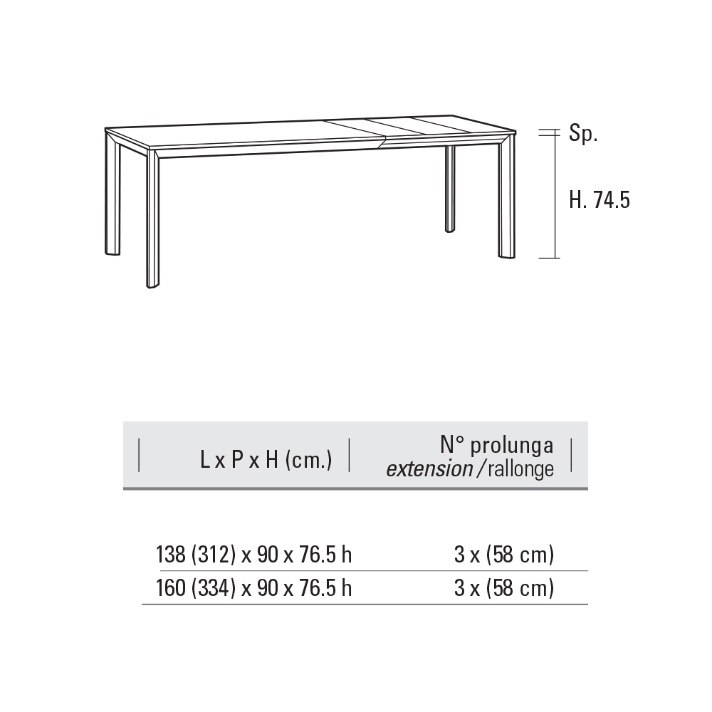 tre forlængere på hver 58 cm lavet i samme materiale som toppen, de tillader dette møbelelement at strække sig op til en maksimal længde på 334 cm, hvilket skaber en