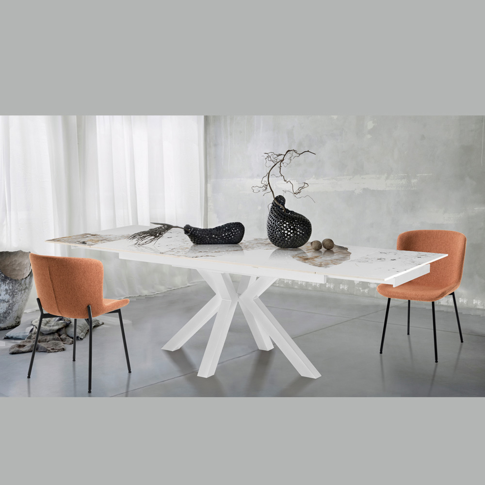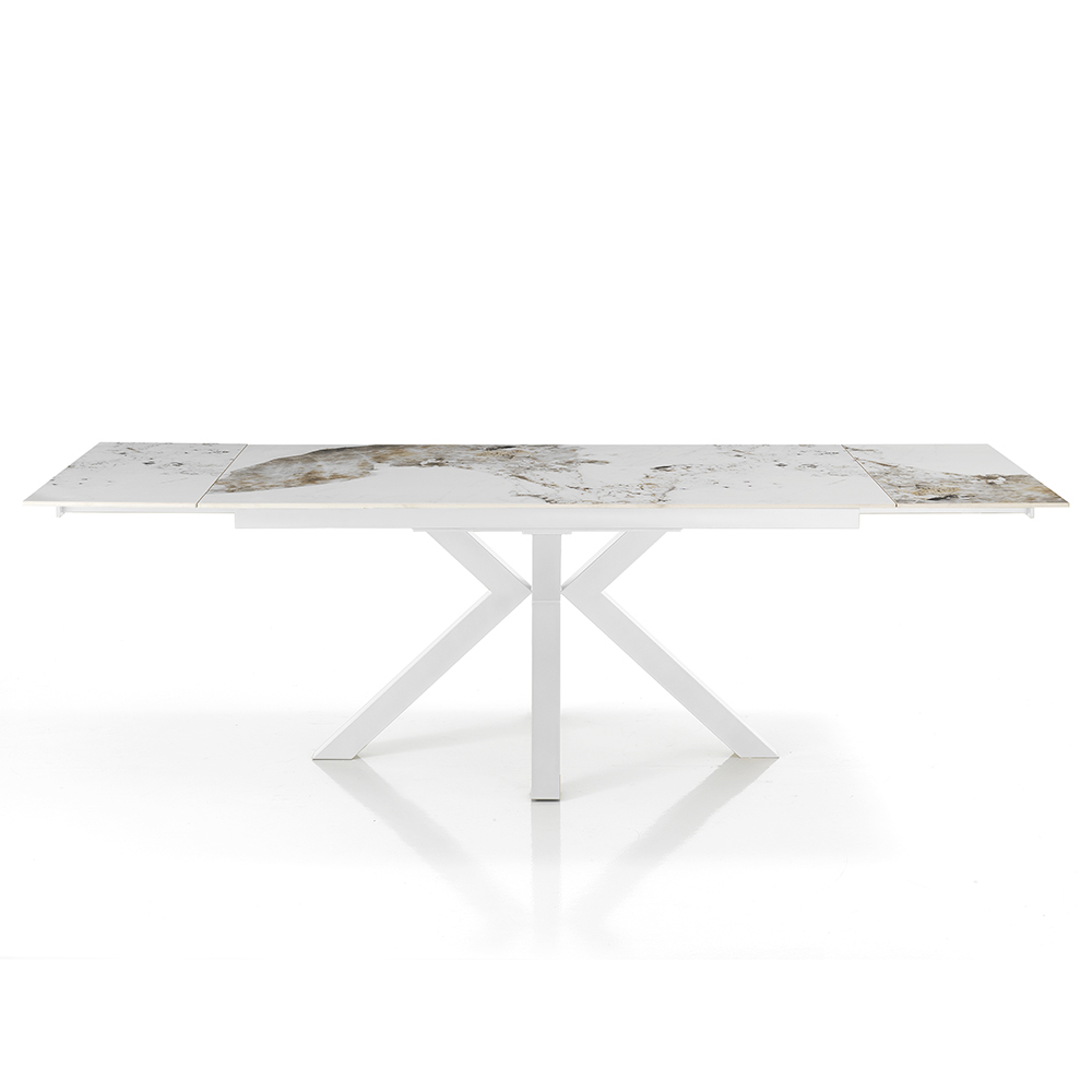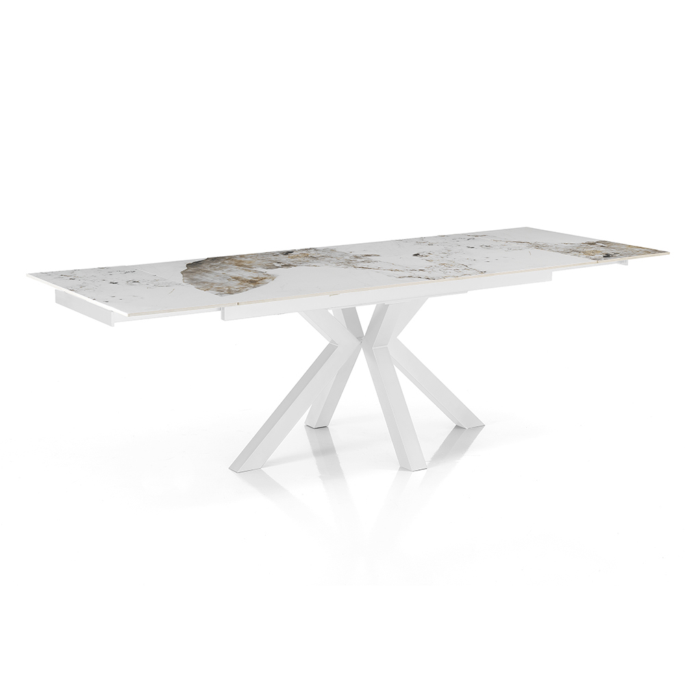 Dette udtræksbord er et mesterværk af moderne design, der kombinerer elegance og funktionalitet i et enkelt stykke luksusmøbel. Bordpladen, lavet af marmor-effekt keramik, er kendetegnet ved indviklede årer, der giver unikke og personlighed til hvert stykke.