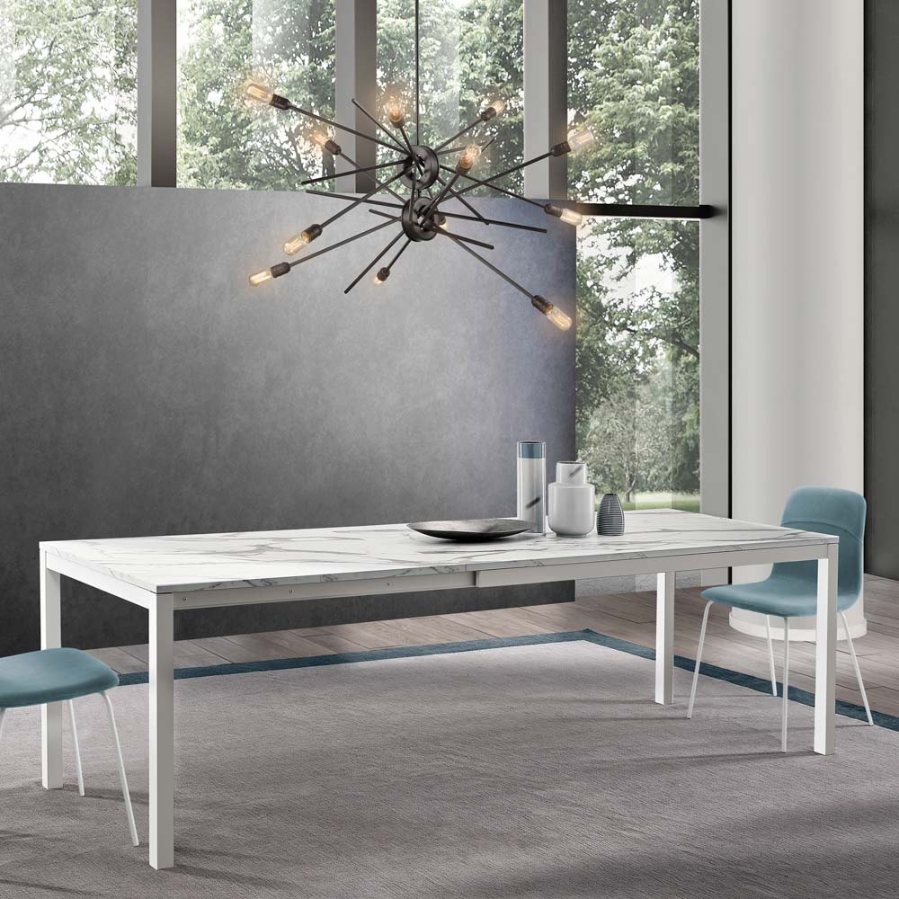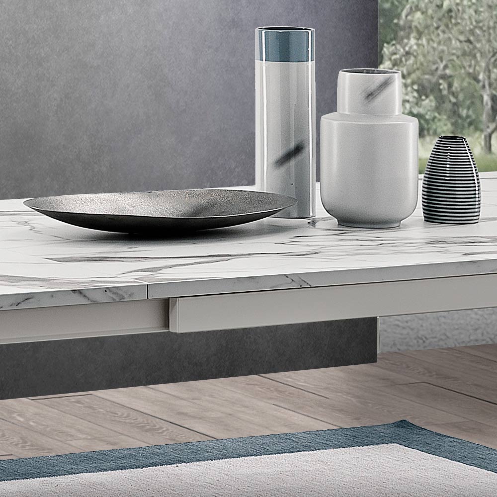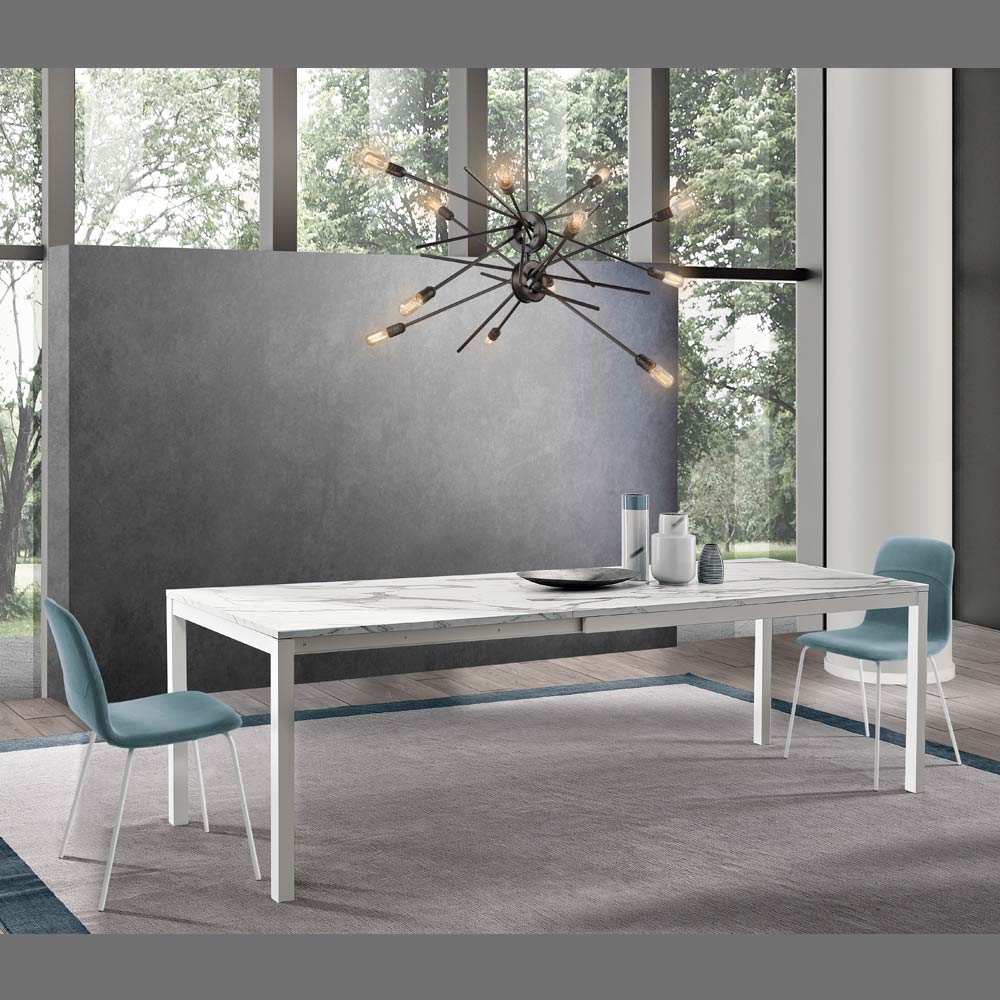 Her er et spisebord , der fejrer lysstyrken og renheden af moderne design. Med en fantastisk calacatta-effekt melamin overflade løfter dette stykke ethvert rum, og blander materialets robusthed med den visuelle lethed, der tilbydes af de hvide metalben . Udseendet er rent, minimalt, men alligevel rigt på detaljer, såsom det subtile og naturlige korn , der nænsomt løber hen over overfladen, og tilbyder en perfekt kombination af funktionalitet og sofistikeret æstetik.