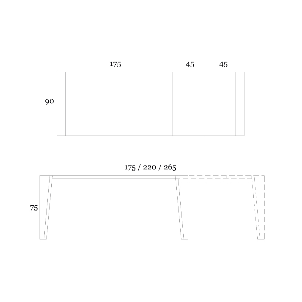 - længde: 175/220/265 cm x dybde: 90 cm x højde: 75 cm - 2 forlængere