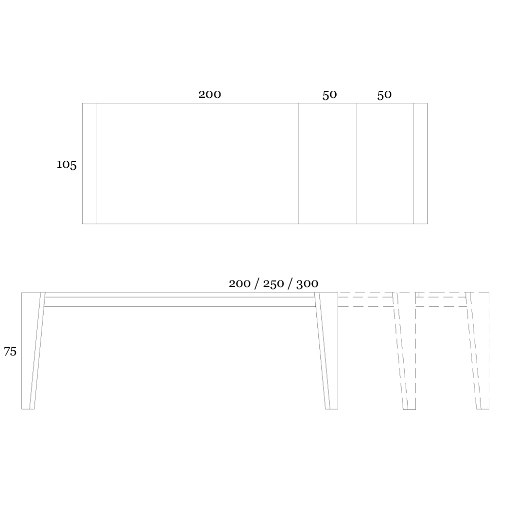 - længde: 200/250/300 cm x dybde: 105 cm x højde: 75 cm - 2 forlængere