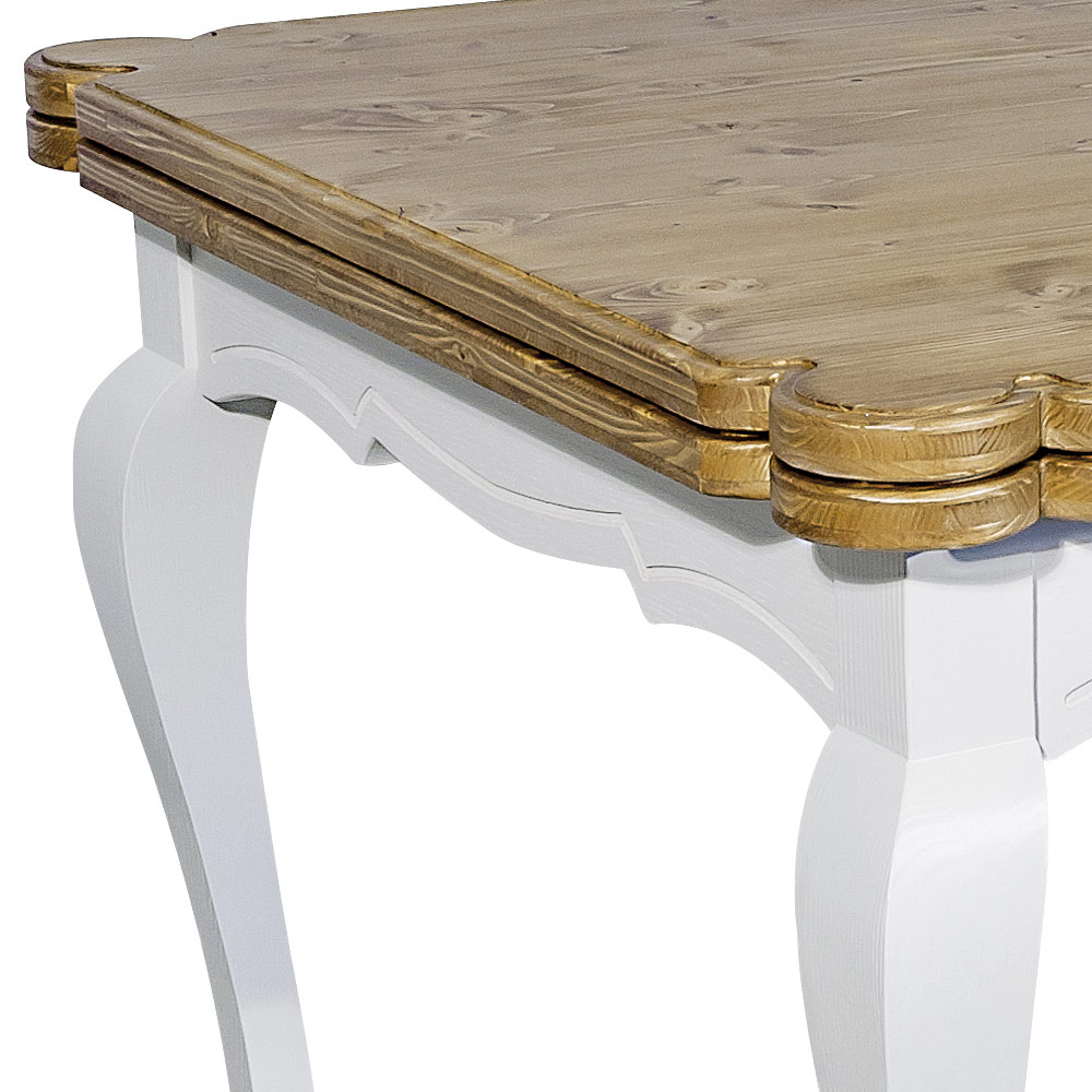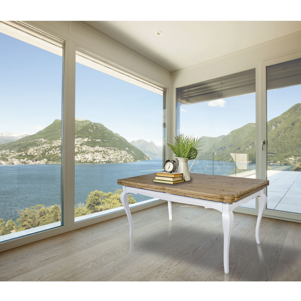 Indendørs udtrækkeligt bord i nordisk gran med Made in Italy formede hjørner.