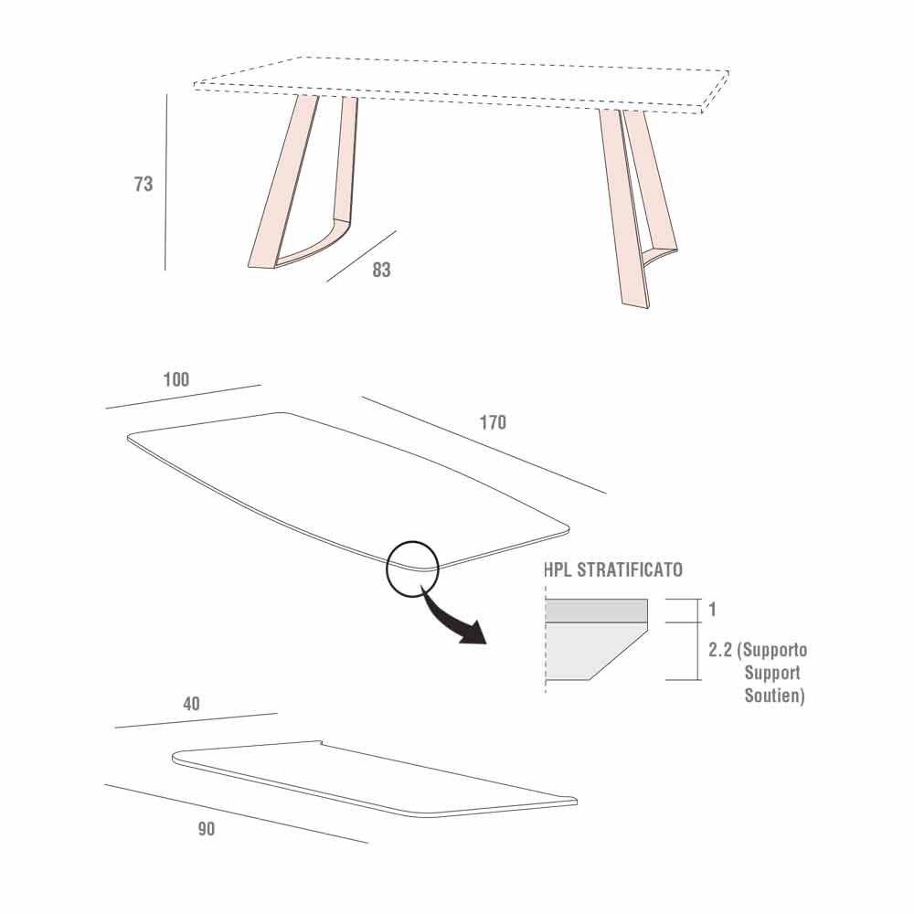 NB : Bordpladen og bunden fås i et stort udvalg af forskellige materialer og finish. Kontinuiteten af kornet mellem toppen og forlængelsen er ikke garanteret