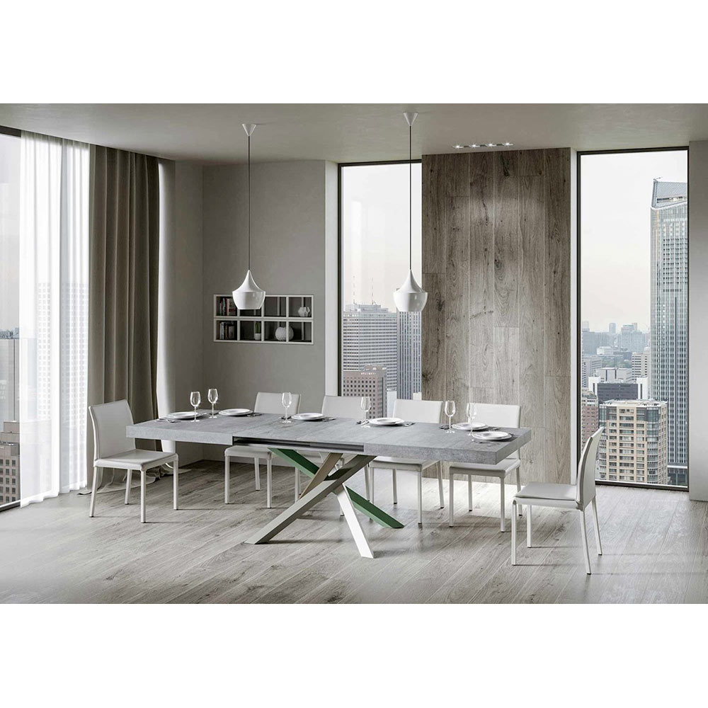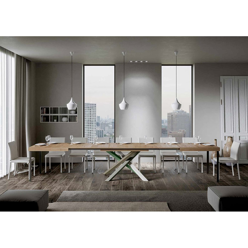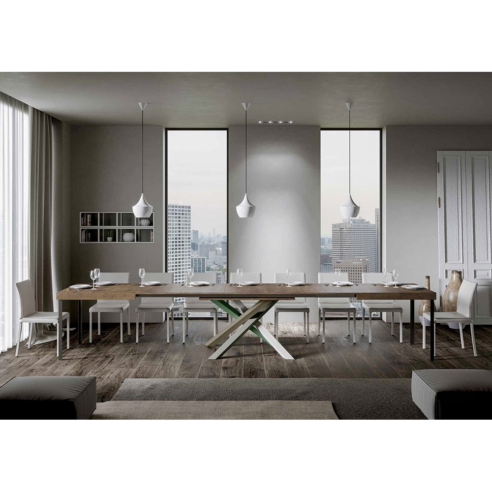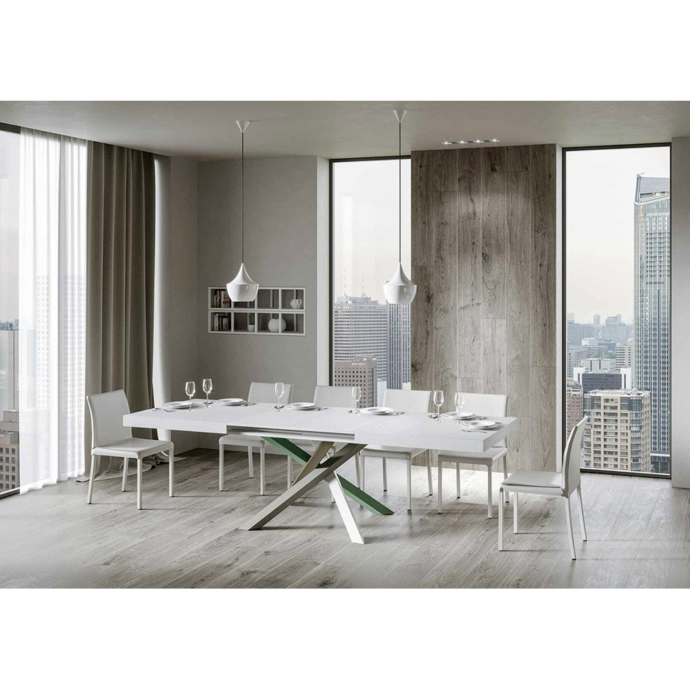 Opdag det udtrækkelige bord, et mesterværk i moderne design, der skiller sig ud med sin unikke silhuet og mångsidige funktionalitet. Træpladen fremhæver rummets lysstyrke og tilbyder en glat og robust overflade, der indbyder til daglig brug. Bordfoden er et ægte geometrisk syn med krydsede ben, der fletter sig sammen i et farvespil. Den foreslåede kombination er: Ben 1: Ren hvid (RAL 9010). Ben 2: Mosgrå (RAL 7003). Ben 3: Olivengrå (RAL 7002). Ben 4: Reseda-grøn (RAL 6011). RAL-farverne er dækkende. Denne kombination tilføjer ikke kun et strejf af vitalitet til designet, men sikrer også stabilitet og styrke. Bordets udtræksmekanisme er lige så enkel som den er teknisk, så dette elegante møbel kan forvandles fra et praktisk bord til fire personer til et hyggeligt område til middage og større forsamlinger.