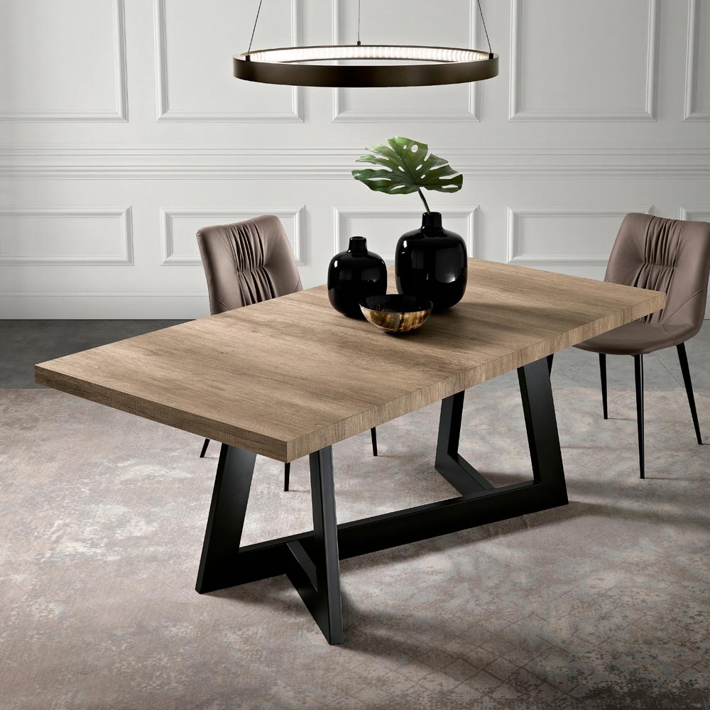 Strukturen er understøttet af metalben , der fletter sig sammen i dristige geometriske former, der kombinerer soliditet og avantgarde design. Kontrasten mellem trætoppens varme og metallets industrialitet skaber en fantastisk visuel balance, hvilket gør dette stykke perfekt til en bred vifte af interiører, fra klassisk til moderne.