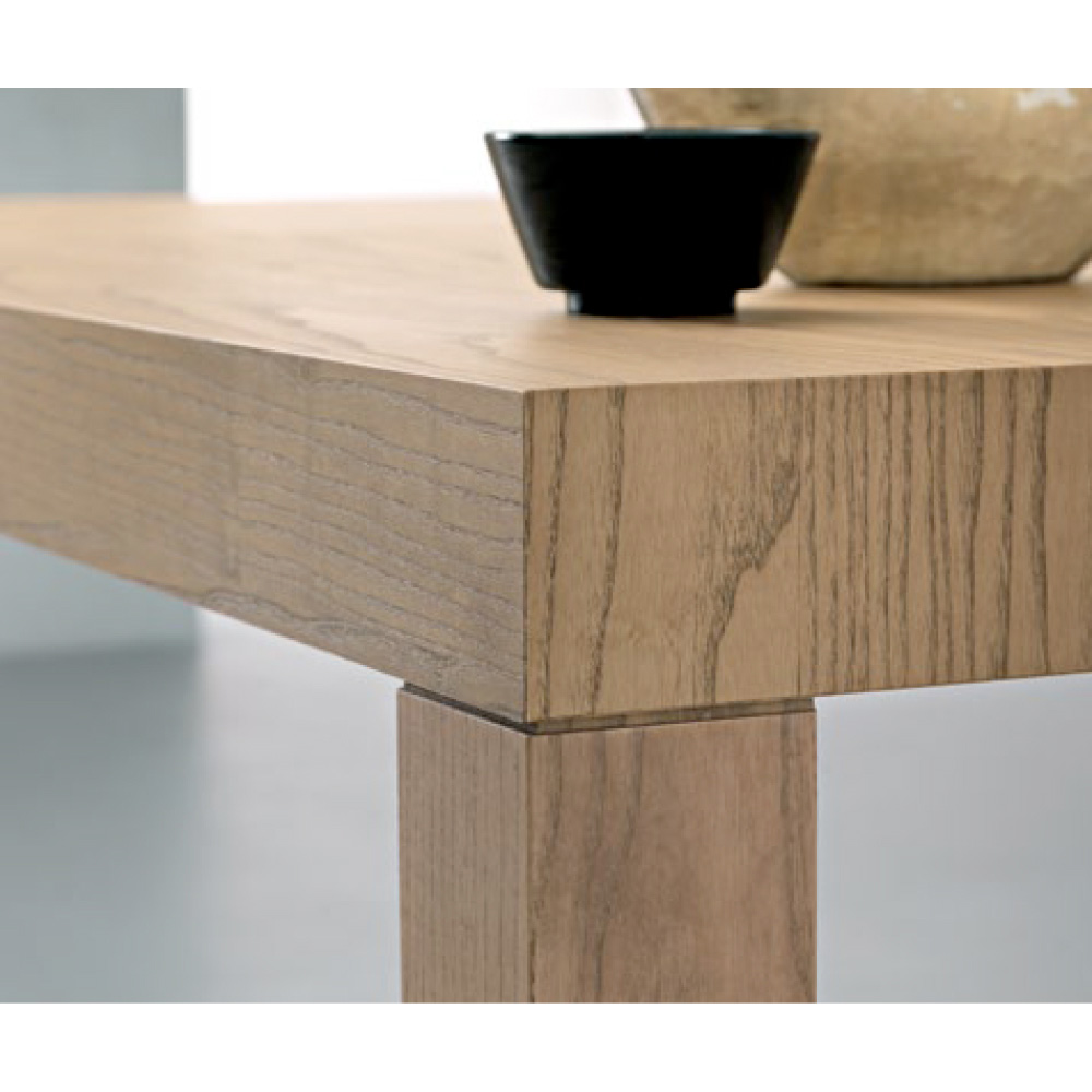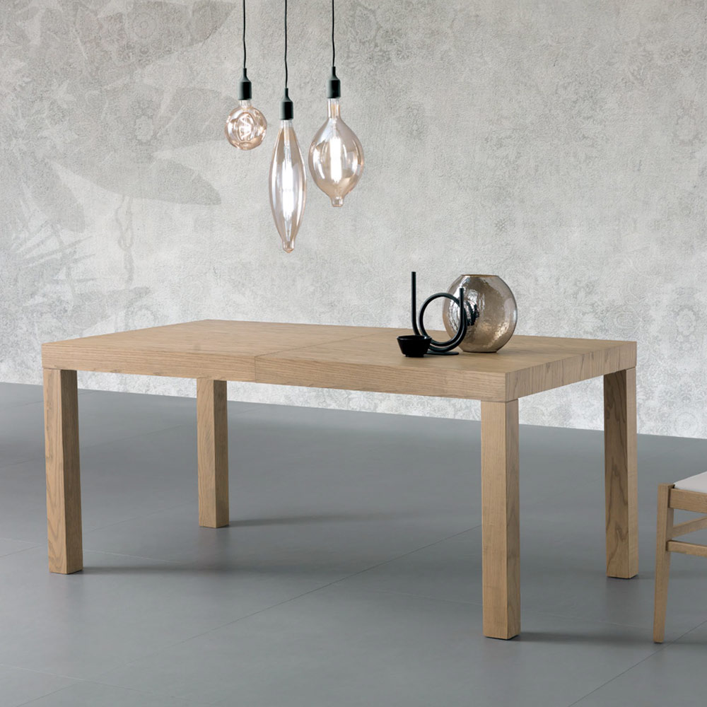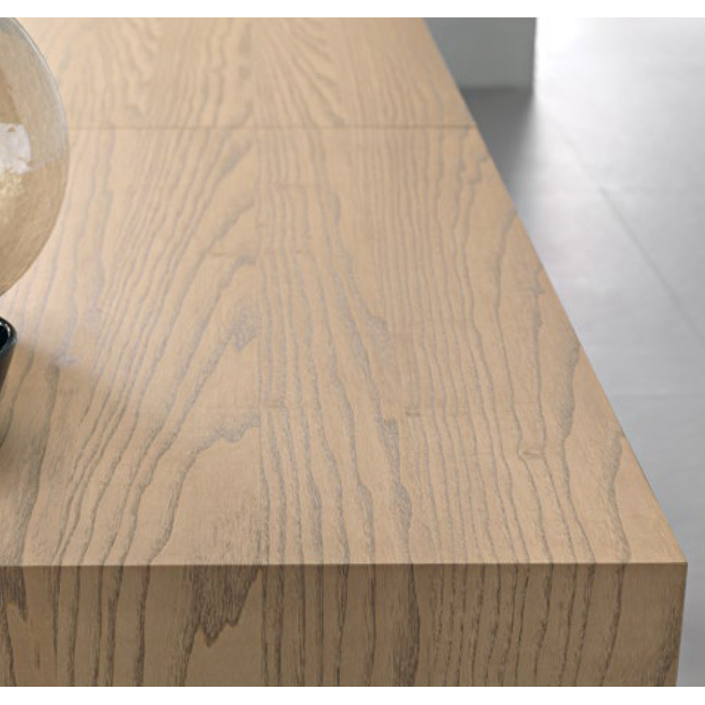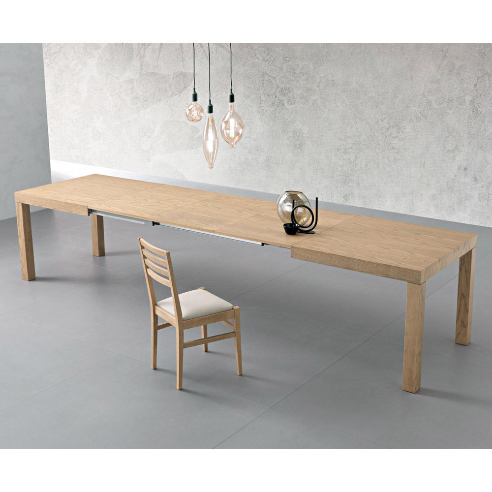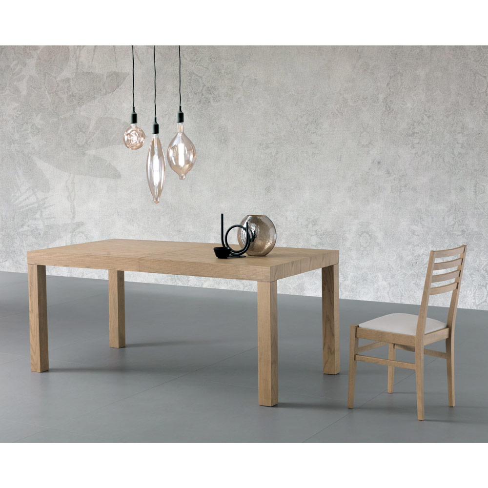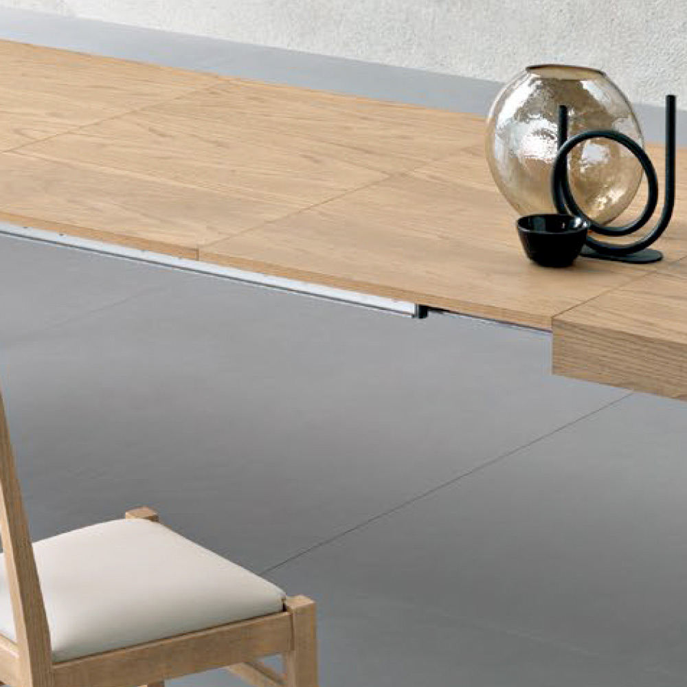 Udtrækkeligt rektangulært bord med bordplade i askefiner. 80 mm tyk, sammenklappelig finish.