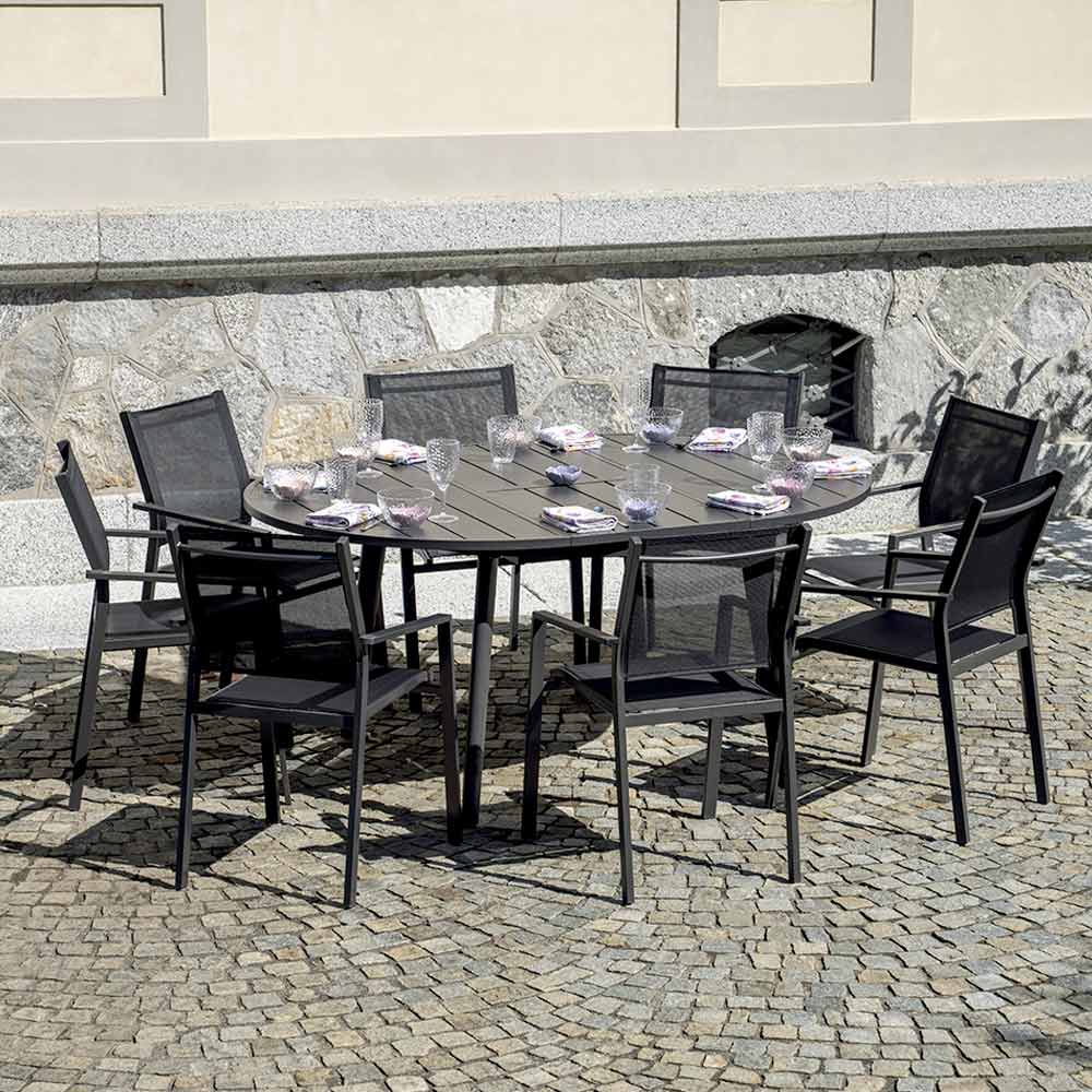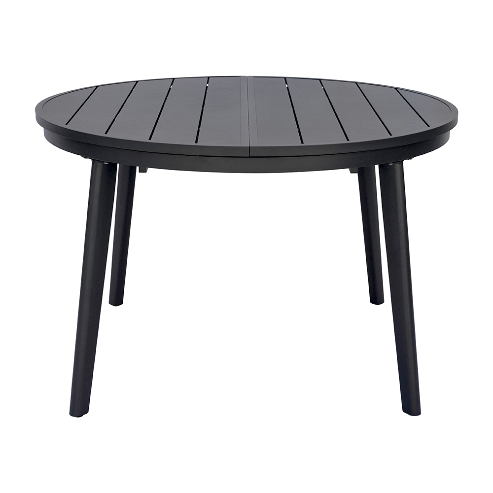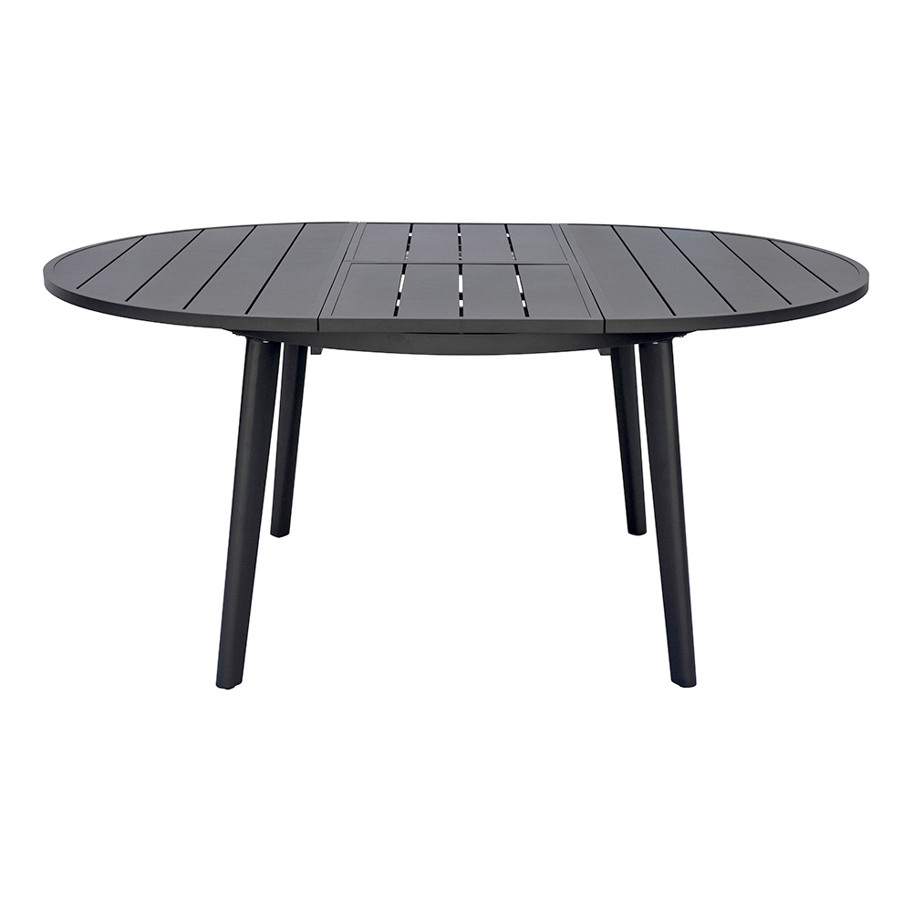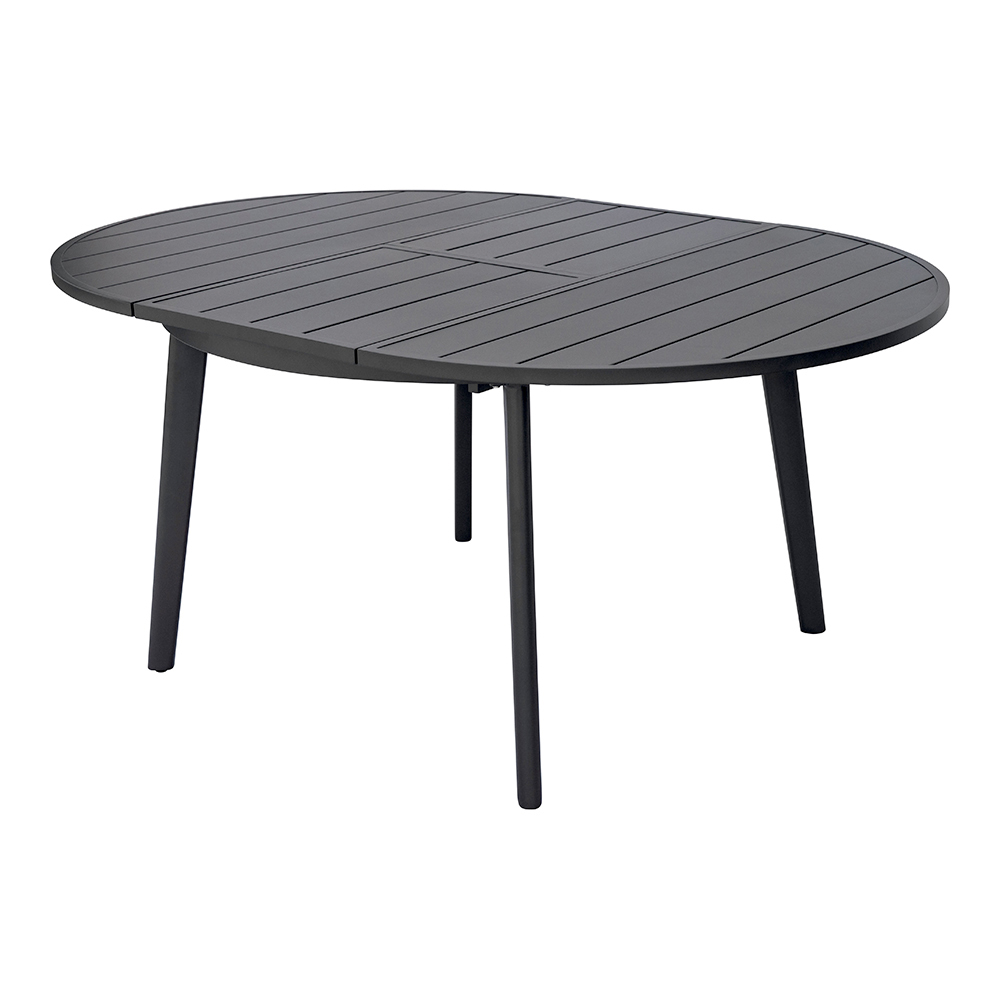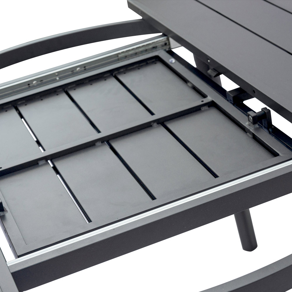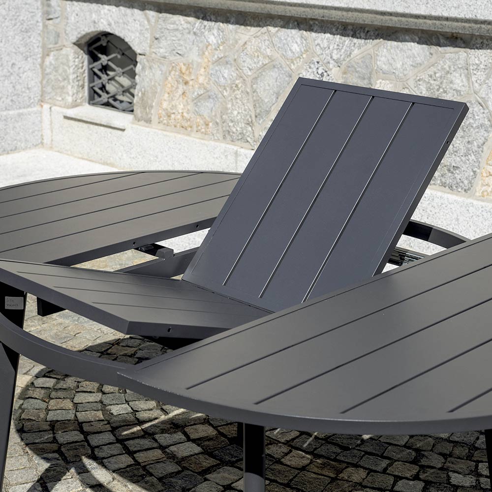 Bordpladen i antracitfarvet aluminium sikrer robusthed og holdbarhed, og den modstår perfekt vejrforhold uden at miste sin glans over tid. De elegante, jævne lameller giver bordet et raffineret og moderne look, mens den solide struktur sikrer stabilitet og lethed på samme tid.