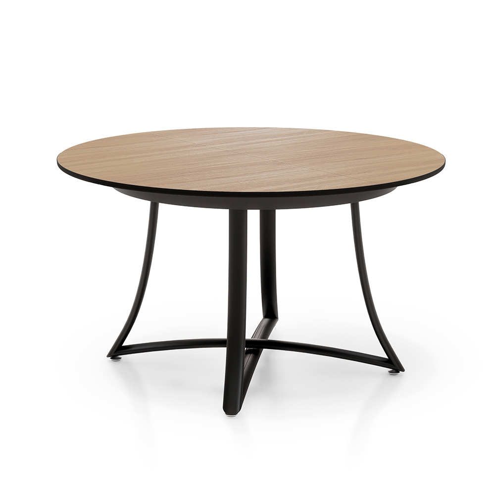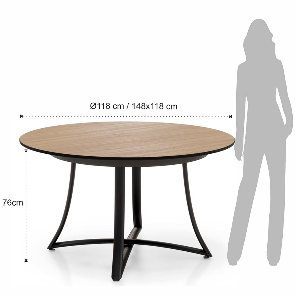 Dette runde udtræksbord er et perfekt eksempel på moderne design , der kombinerer funktionalitet og stil. Med en træplade formidler dette bord en varm og indbydende atmosfære, mens den sorte metalbund tilbyder en stærk visuel kontrast, der tilføjer et strejf af moderne elegance til helheden.