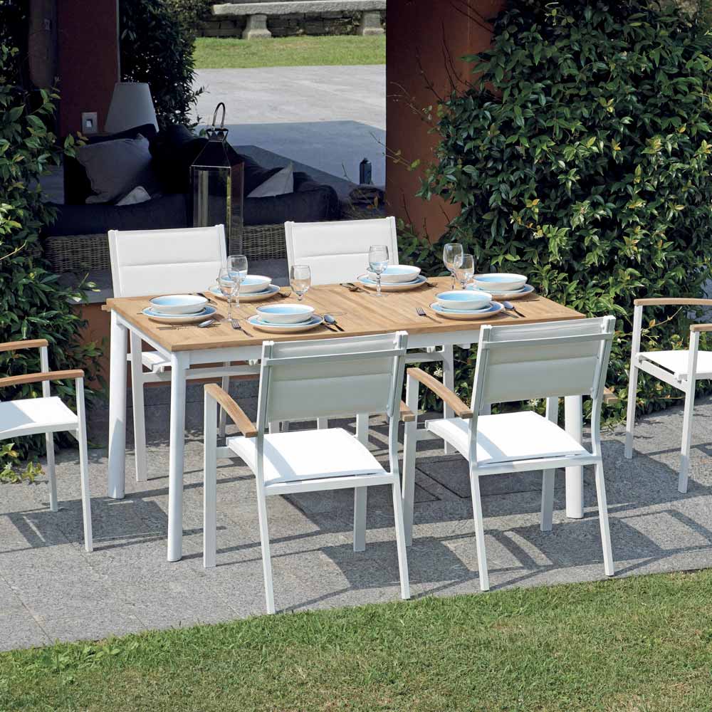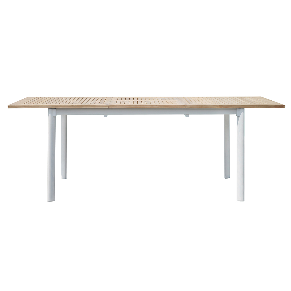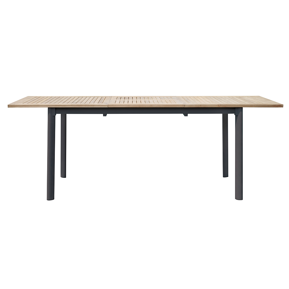 Bordet kan udvides , så du nemt kan tilpasse det til dine behov, uanset om du arrangerer en intim middag eller en stor frokost med venner og familie. Kombinationen af teak og aluminium er ikke kun æstetisk tiltalende, men også ekstremt praktisk, hvilket gør dette bord til et ideelt valg til enhver udendørs lejlighed.