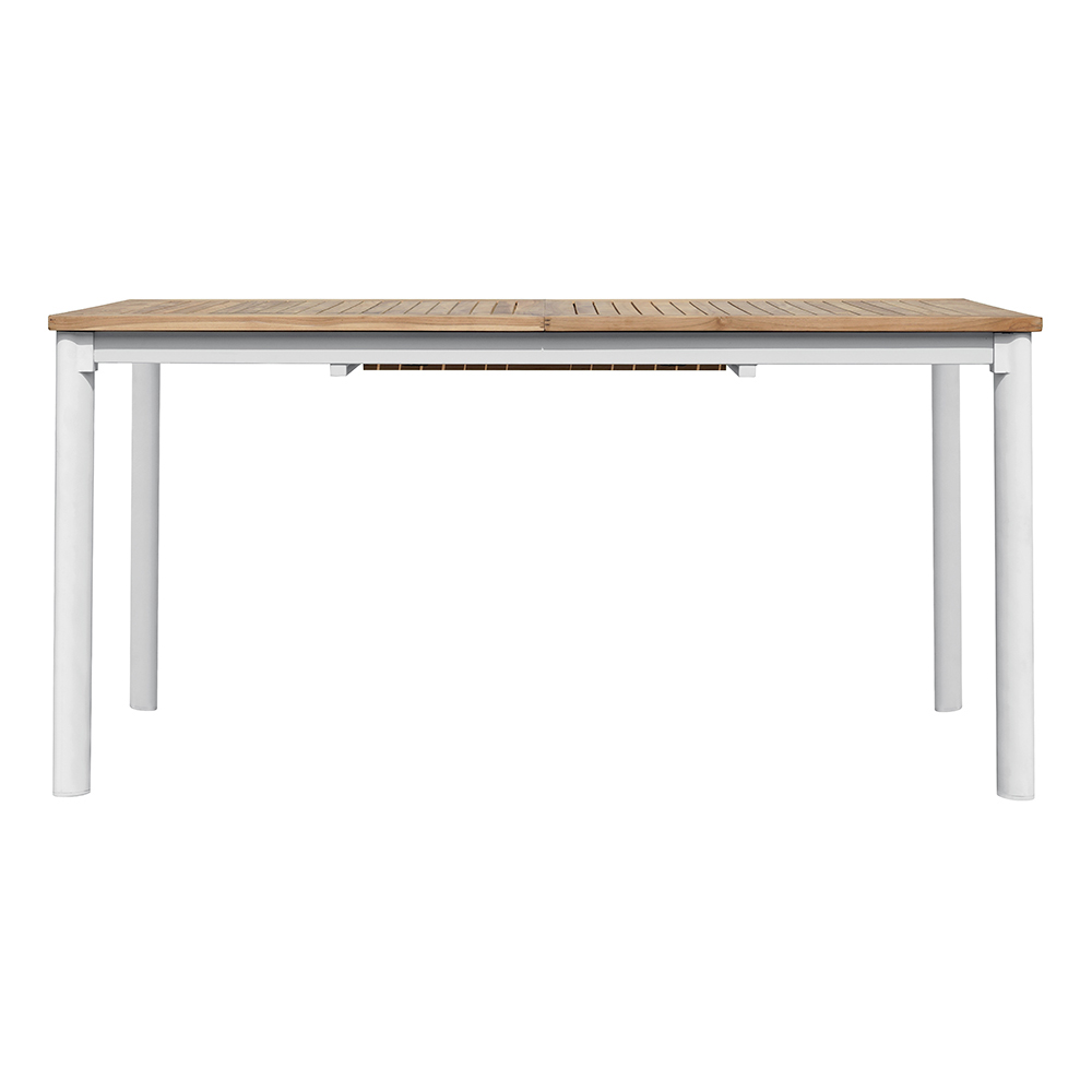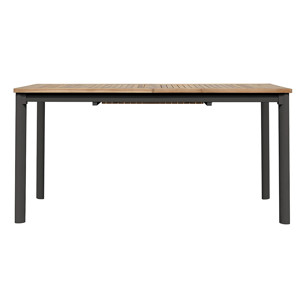 Bordpladen er lavet af højkvalitets teaktræ , kendt for sin holdbarhed og vejrbestandighed. Teaktræ med sine varme naturlige toner tilføjer et strejf af varme og sofistikering til dit udendørsrum. De robuste, lette aluminiumsben tilbyder fremragende stabilitet og korrosionsbestandighed, hvilket sikrer, at bordet bevarer sin skønhed over tid.