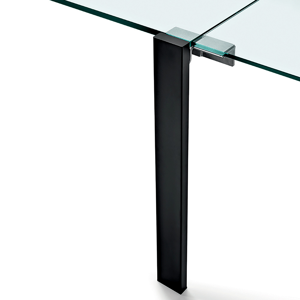 Ekstra klart glasbord, der kan forlænges op til 170 cm, med metalfod, fremstillet i Italien.