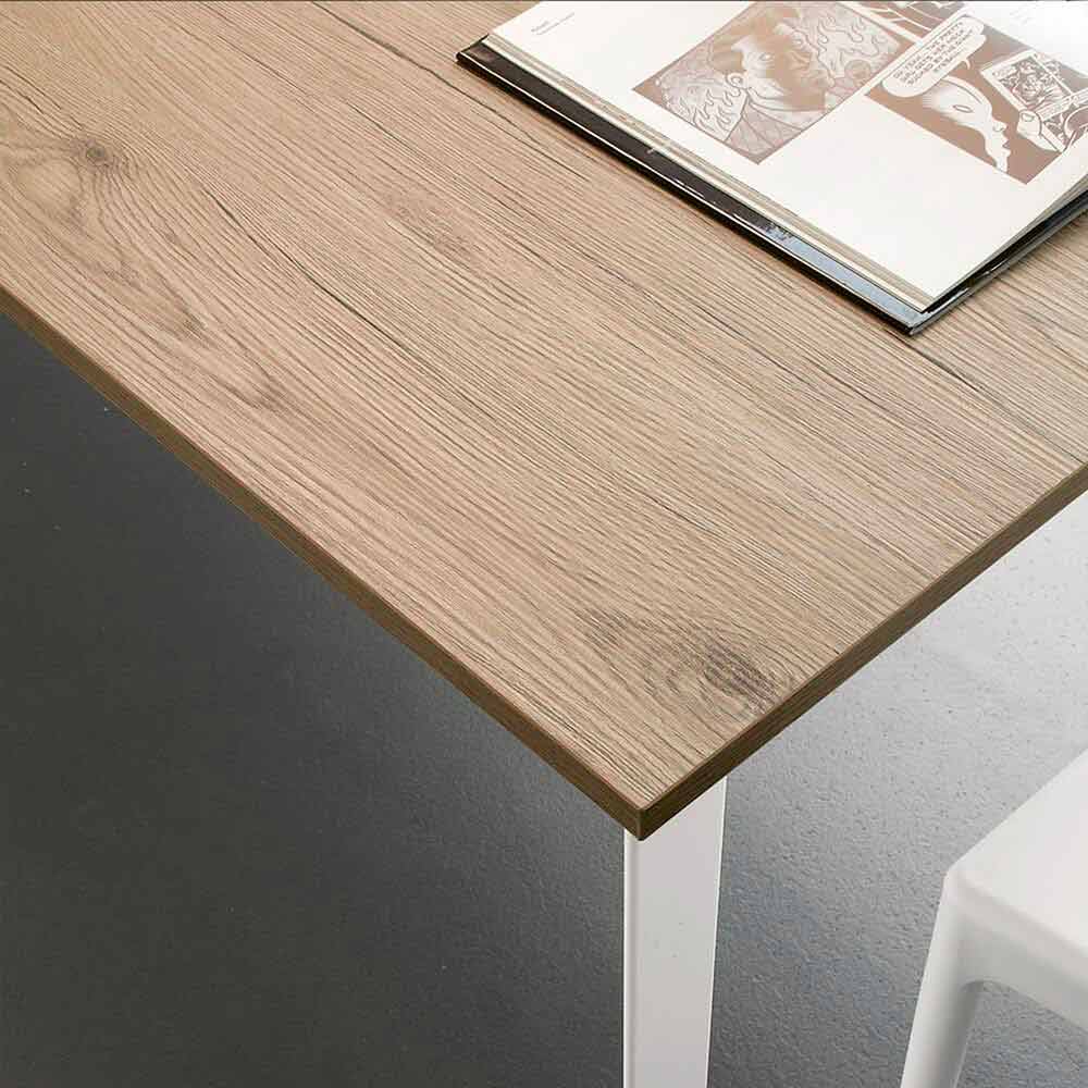Spisebord fremstillet i Italien med melaminplade (tykkelse 20 mm) med barkfinish, forlængelse i melamin, der matcher toppen og bunden i hvidmalet metal .