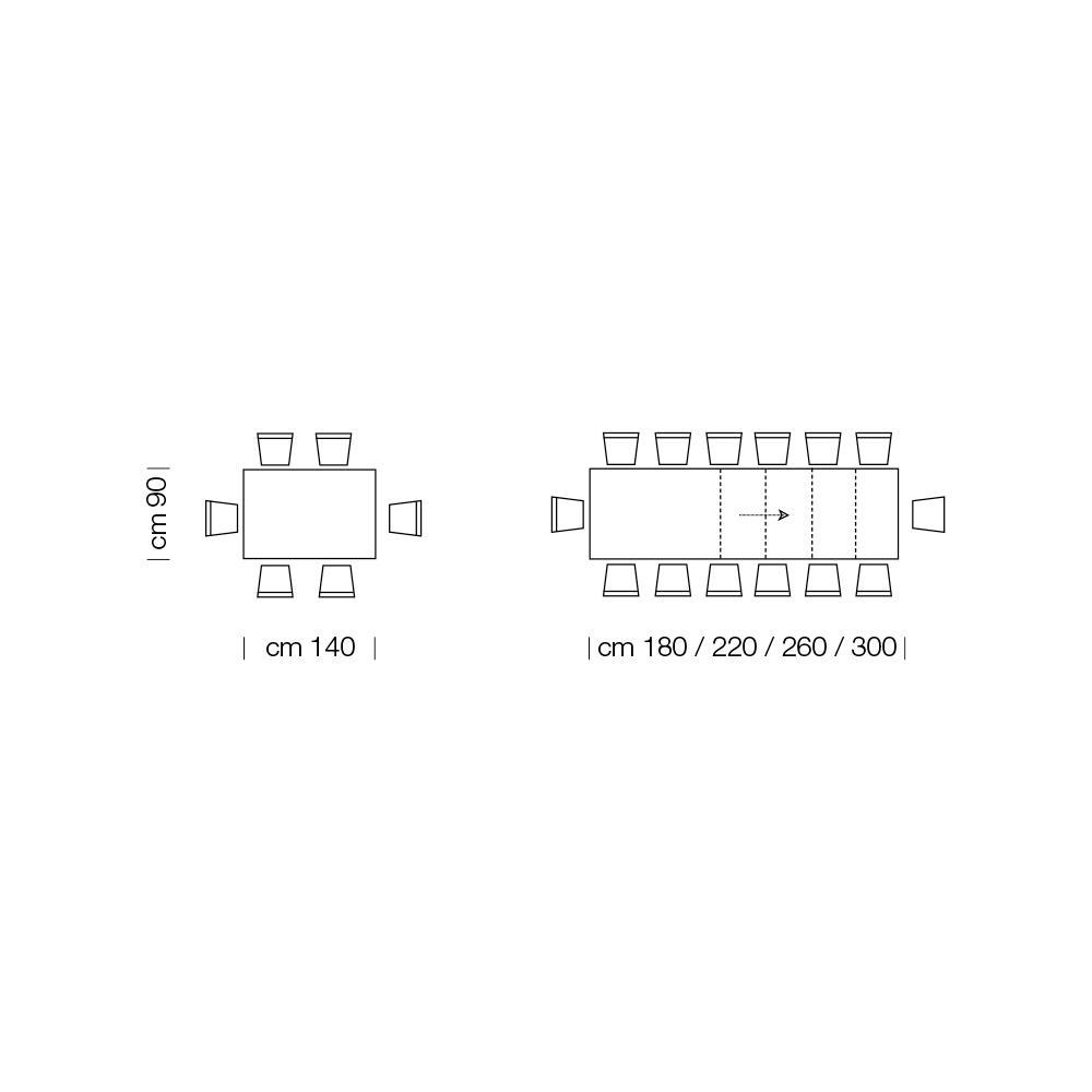 - L 140 (300) x D 90 x H 75 cm 14 personers forlængelse med fire indvendige forlængere på hver 40 cm;