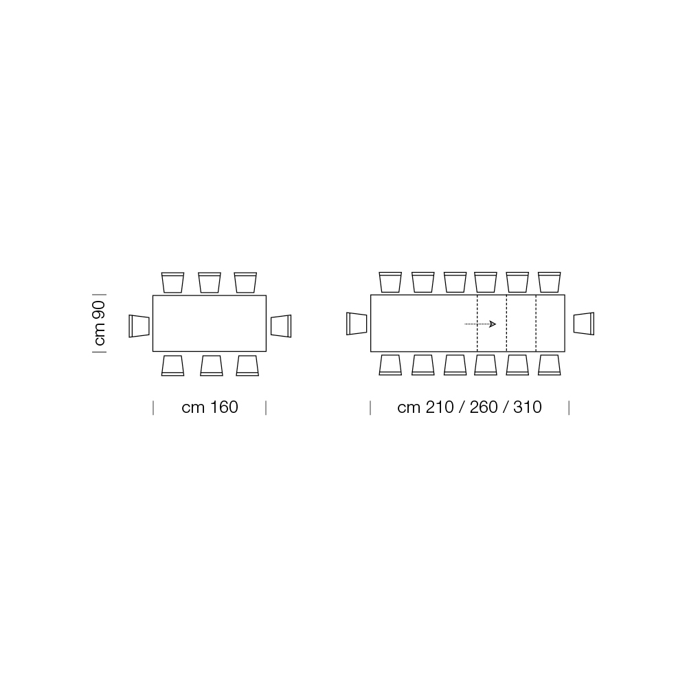 - L 160 (310) x D 90 x H 75 cm 14 personers udtrækbar med tre indvendige forlængere på hver 50 cm.