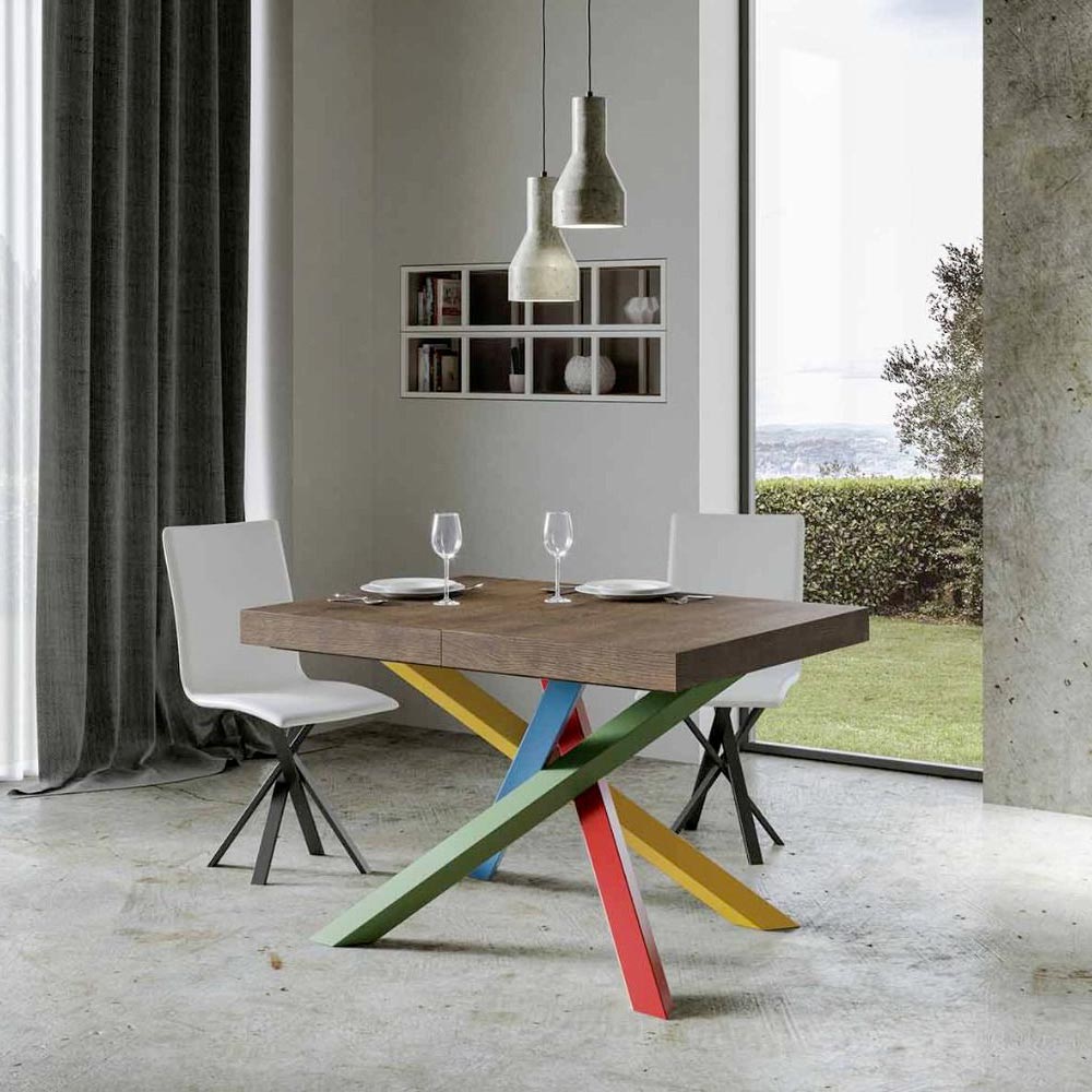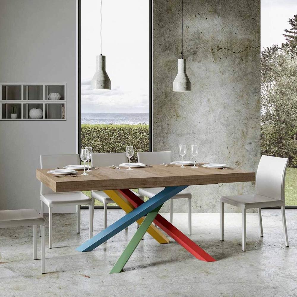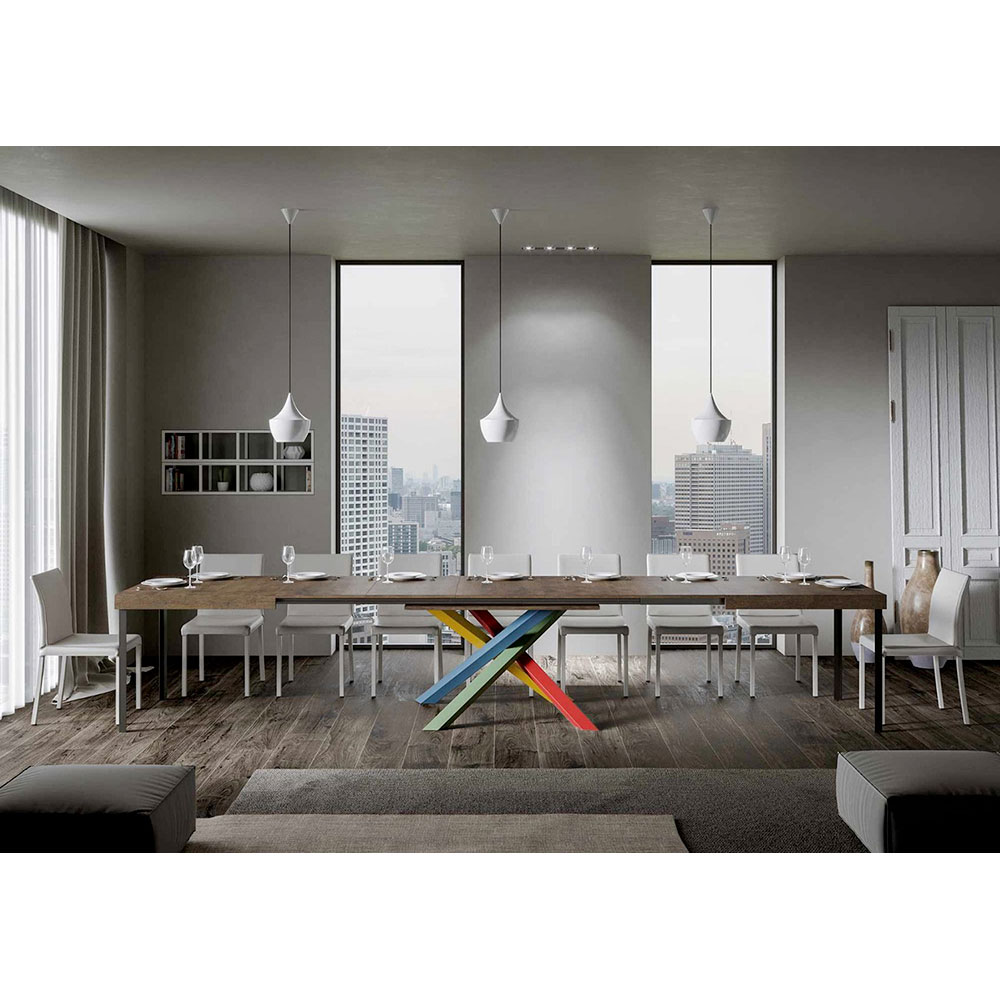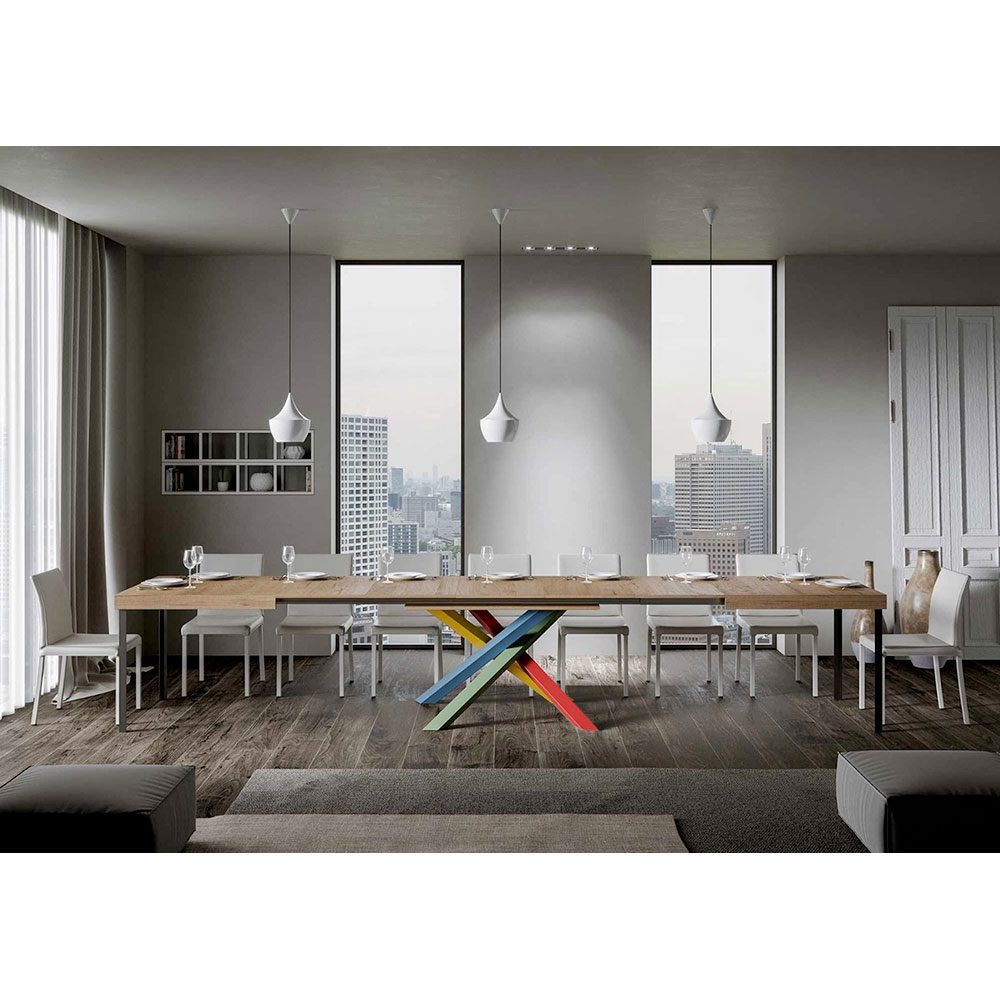 Opdag det udtrækkelige bord, et mesterværk i moderne design, der skiller sig ud med sin unikke silhuet og mångsidige funktionalitet. Træpladen fremhæver rummets lysstyrke og tilbyder en glat og robust overflade, der indbyder til daglig brug. Bordfoden er et ægte geometrisk syn med krydsede ben, der fletter sig sammen i et farvespil. Den foreslåede kombination er: Ben 1: Karminrød (RAL 3002). Ben 2: Gullig grøn (RAL 6018). Ben 3: Distant Blue (RAL 5023). Ben 4: Signalgul (RAL 1003). RAL-farver er dækkende. Denne kombination tilføjer ikke kun et strejf af vitalitet til designet, men sikrer også stabilitet&strong> og styrke. Bordets udtræksmekanisme er lige så enkel som den er teknisk, så dette elegante møbel kan forvandles fra et praktisk bord til fire personer til et hyggeligt område, hvor man kan holde større middage og møder.