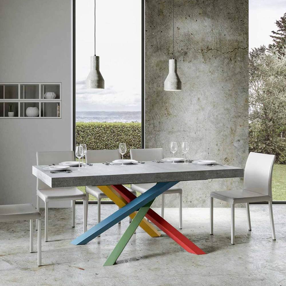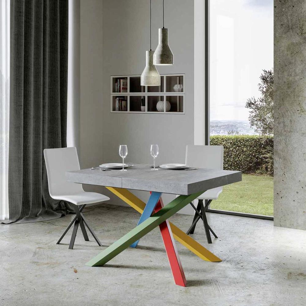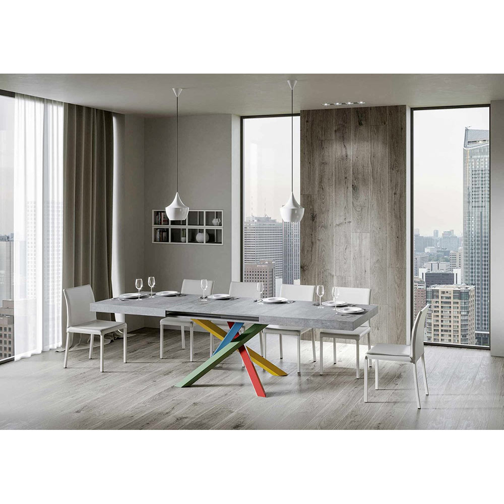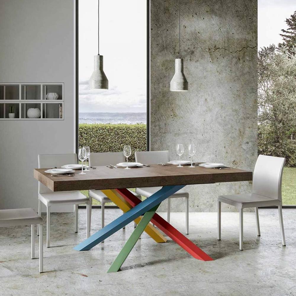 Opdag det udtrækkelige bord, et mesterværk i moderne design, der skiller sig ud med sin unikke silhuet og mångsidige funktionalitet. Træpladen fremhæver rummets lysstyrke og tilbyder en glat og robust overflade, der indbyder til daglig brug. Bordfoden er et ægte geometrisk syn med krydsede ben, der fletter sig sammen i et farvespil. Den foreslåede kombination er: Ben 1: Karminrød (RAL 3002). Ben 2: Gullig grøn (RAL 6018). Ben 3: Distant Blue (RAL 5023). Ben 4: Signalgul (RAL 1003). RAL-farver er dækkende. Denne kombination tilføjer ikke kun et strejf af vitalitet til designet, men sikrer også stabilitet&strong> og styrke. Bordets udtræksmekanisme er lige så enkel som den er teknisk, så dette elegante møbel kan forvandles fra et praktisk bord til fire personer til et hyggeligt område, hvor man kan holde større middage og møder.