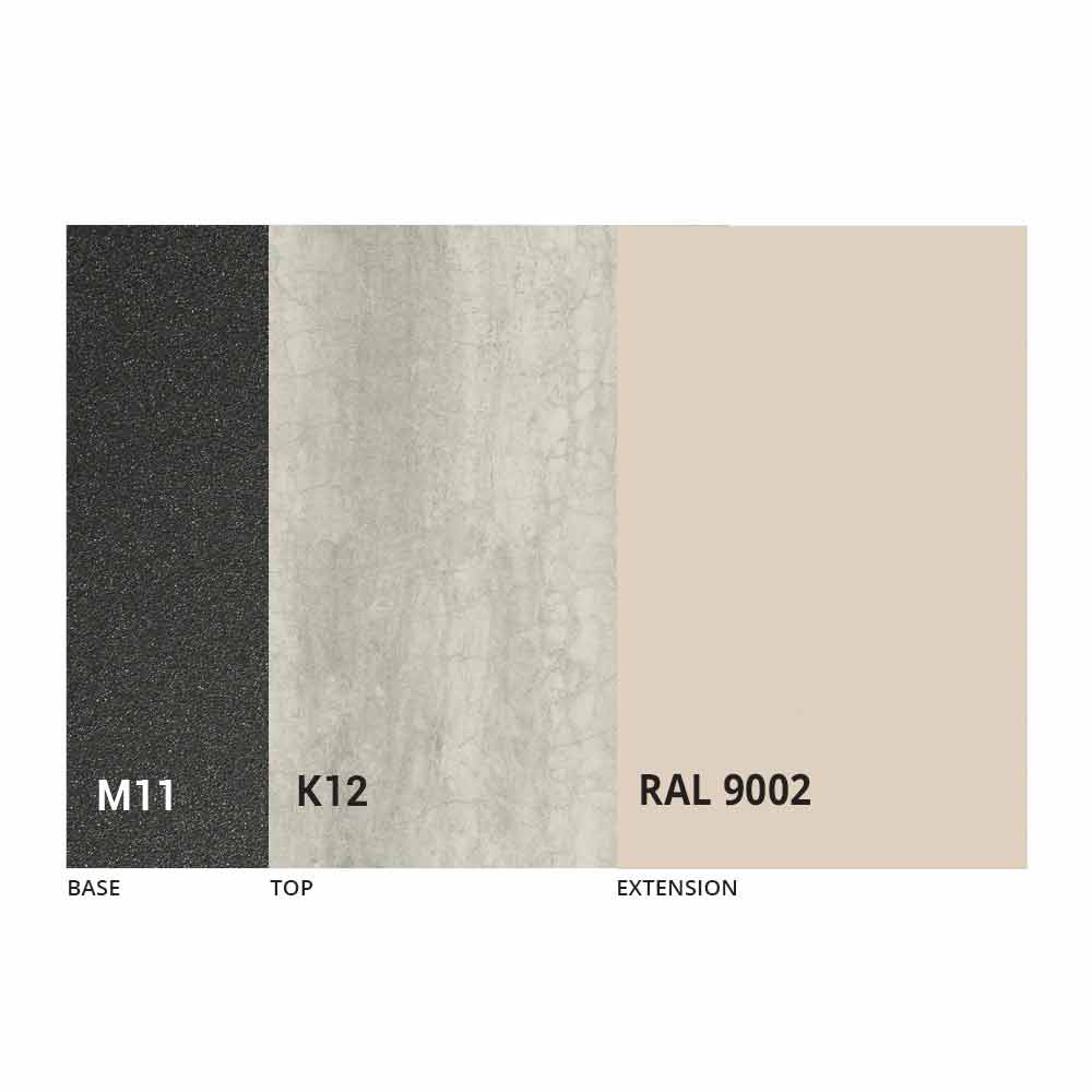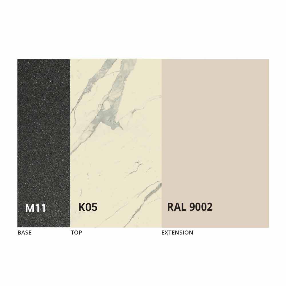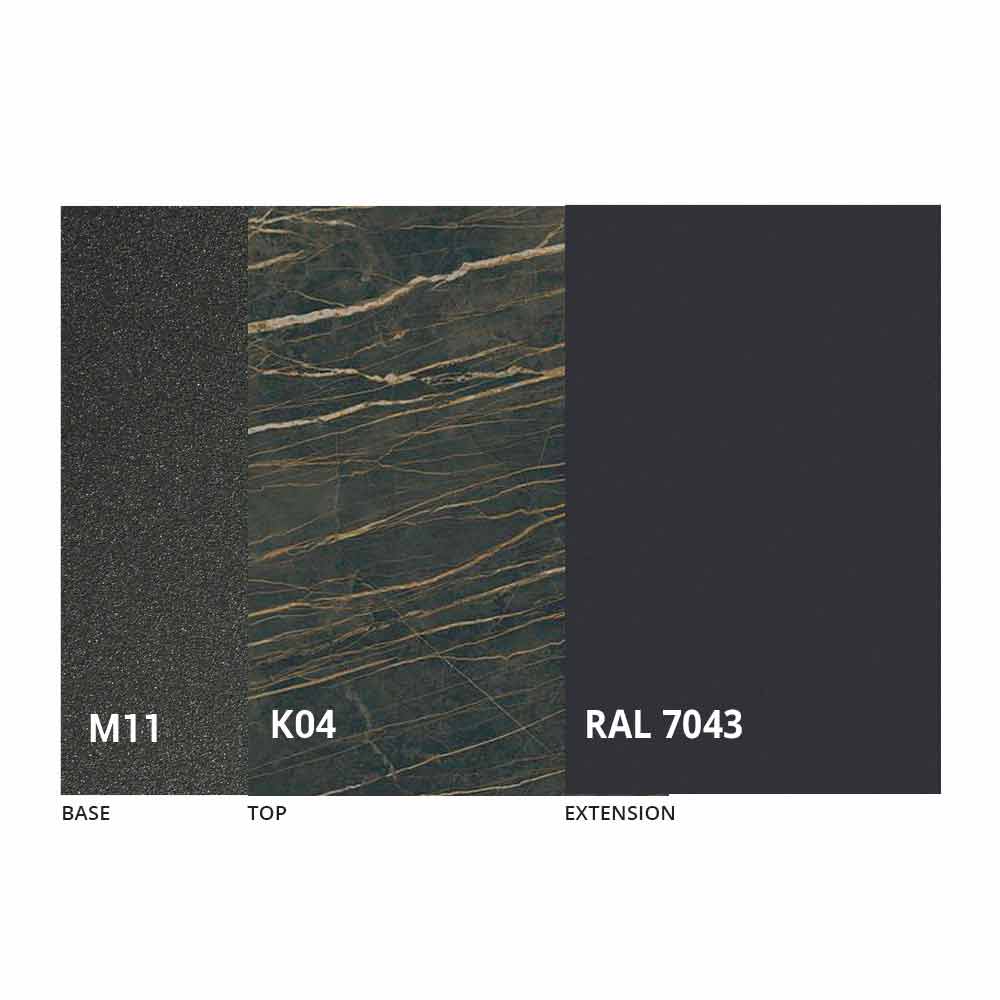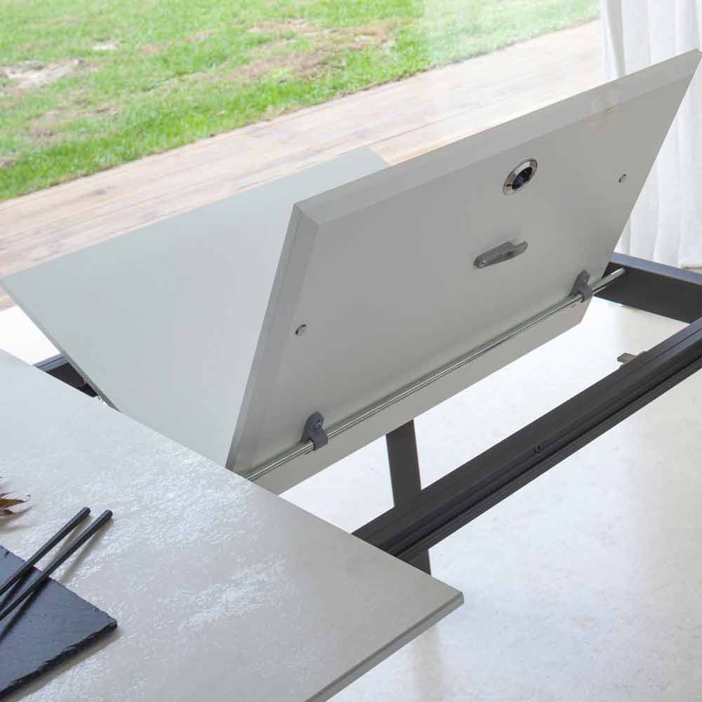 Dette udtræksbordhar et yderst moderne design og er velegnet til ethvert levende behov, i stand til at kombinere æstetisk smag med funktionalitet og give en yderst effektiv visuel og taktil effekt. Dens ejendommelige karakteristika er givet af den trekantede form på benene , som skitserer en stil minimal og absolut elegant. Håndlavet i Italien med materialer af høj kvalitet og 100% lavet i Italien. Karakteriseret ved en laminam keramisk toppå et melaminpanel og præget grafitmalet metalbund , kan toppen forlænges takket være en teleskopmekanisme med en indvendig foldeforlænger i samme farve som det underliggende panel.