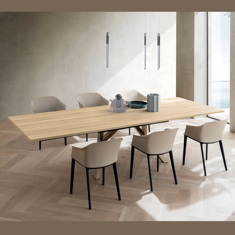 Den krydsede base i malet metal tilføjer et strejf af moderne design , samtidig med at den sikrer stabilitet og robusthed . Benenes sammenflettede spil giver karakter og bevægelse til hele bordet, hvilket gør det velegnet til både private og offentlige miljøer.
