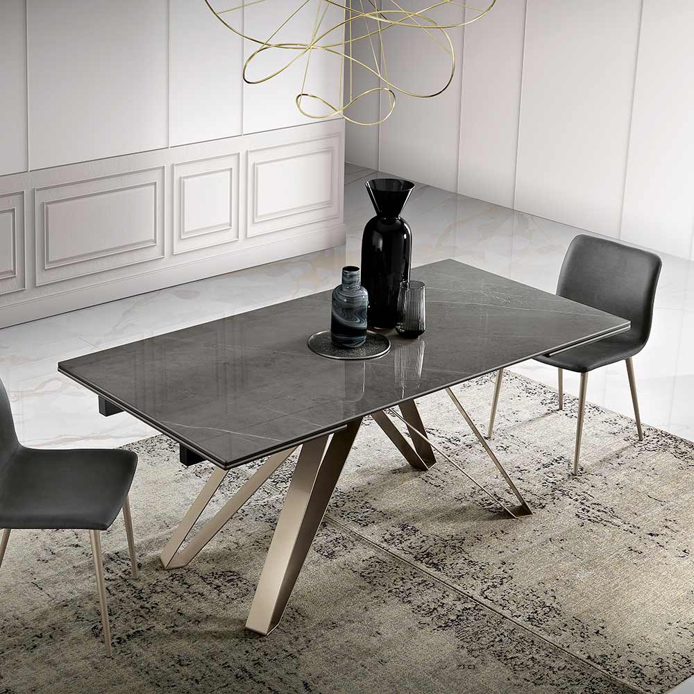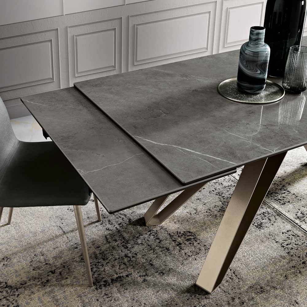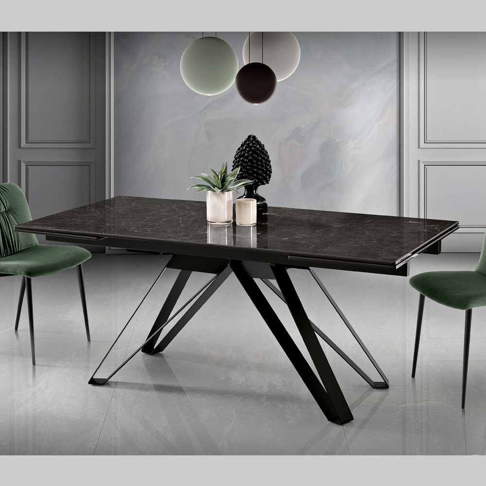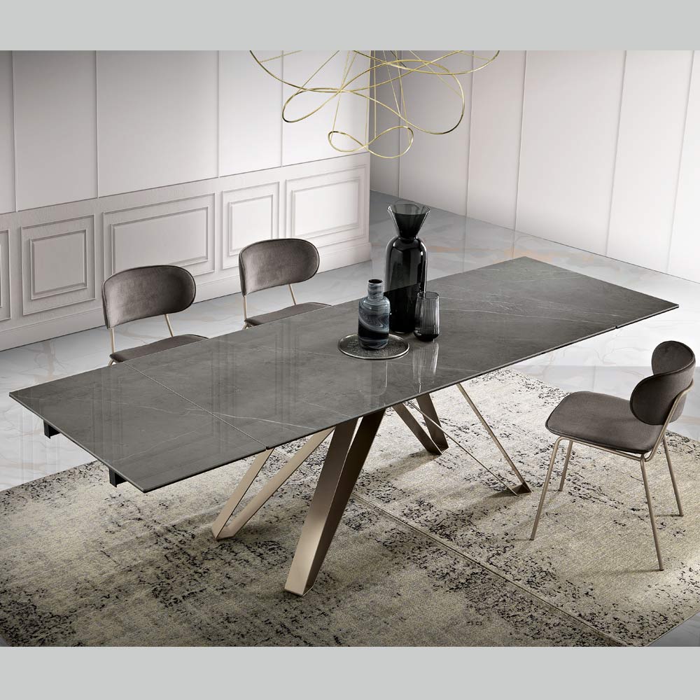 Nedsænket i en sofistikeret farvepalet er dette udvidelige bord eksemplet på moderne elegance. Den glaskeramiske top er en æstetisk triumf, et naturligt lærred, hvorpå der er tegnet årer, som tilføjer dybde og bevægelse til overfladen.