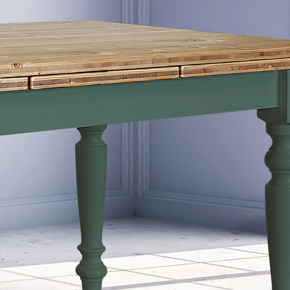 Udtrækbart stuebord i knudret nordisk gran. Benene er drejet i