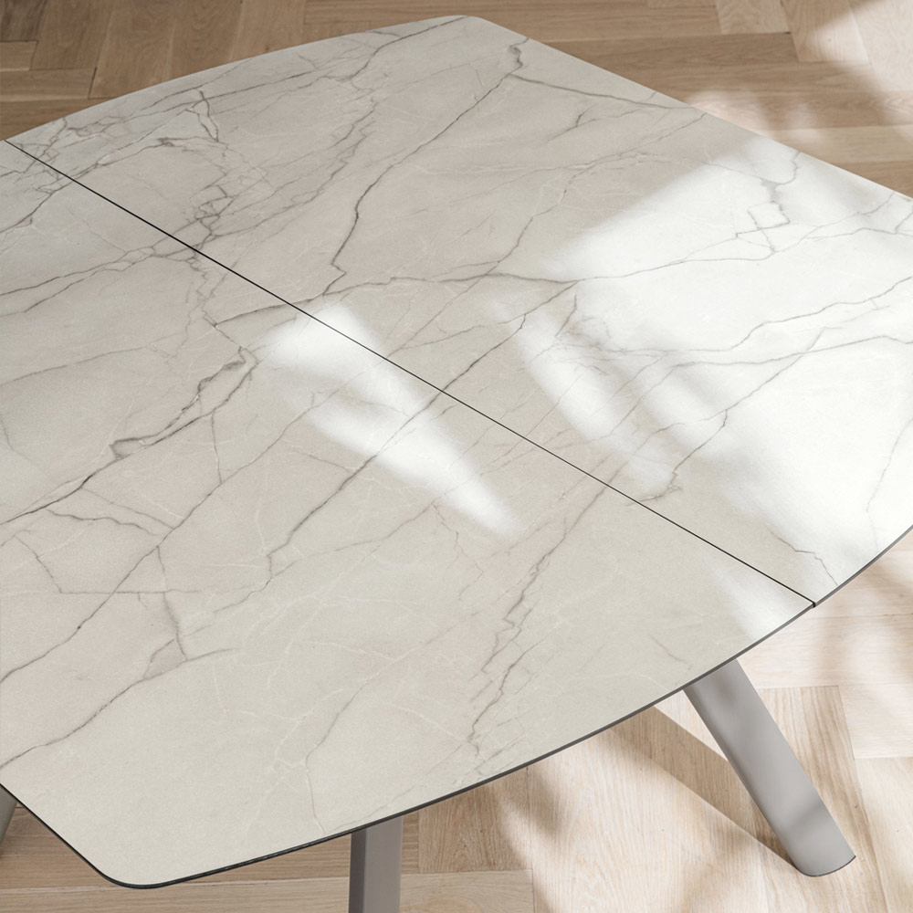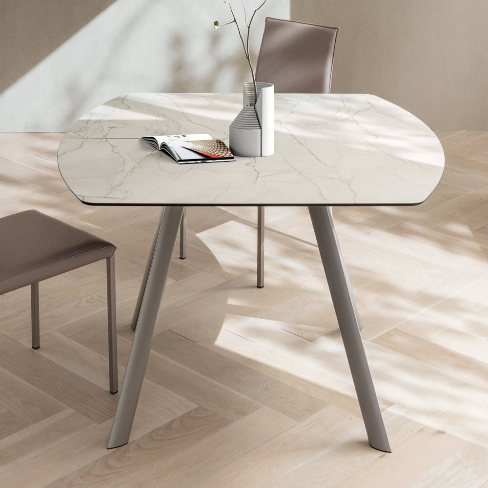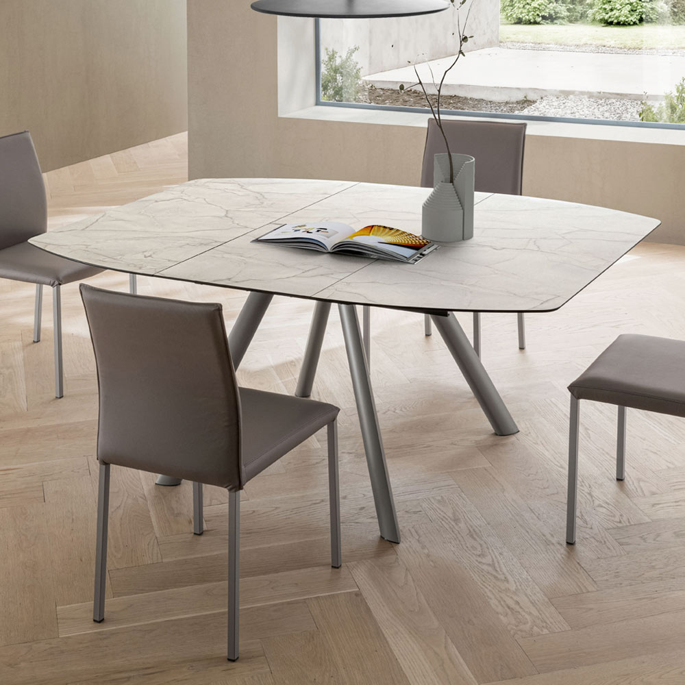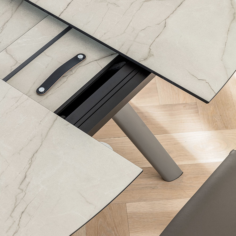 HPL- bordpladen tilføjer lysstyrke og raffinement til miljøet og minder om stenens årer med en modstandsdygtig overflade. Takket være det centrale forlængersystem kan bordet nemt trækkes ud, hvilket giver ekstra plads til gæster eller familiefrokoster, og det bevarer en harmonisk linje, selv når det er åbent.