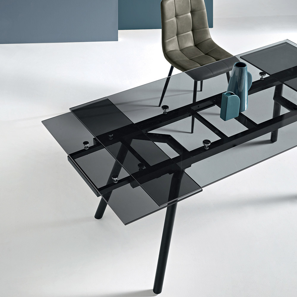 Et elegant, moderne, udtrækkeligt spisebord , ideelt til stilfuld indretning af din spisestue eller stue . Den røgede glasplade tilføjer lysstyrke og visuel lethed til rummet, mens den sortmalede metalbase sikrer stabilitet og holdbarhed og skaber en perfekt balance mellem moderne æstetik og funktionalitet.