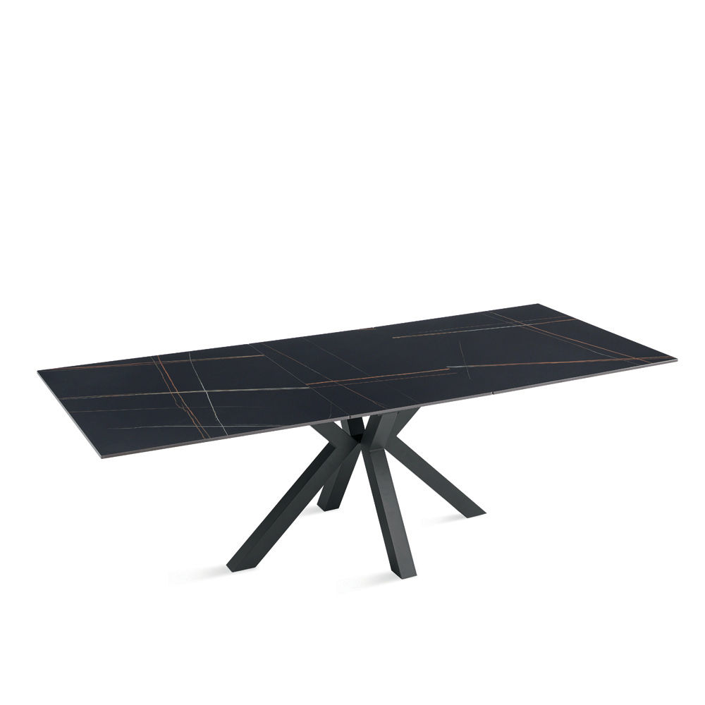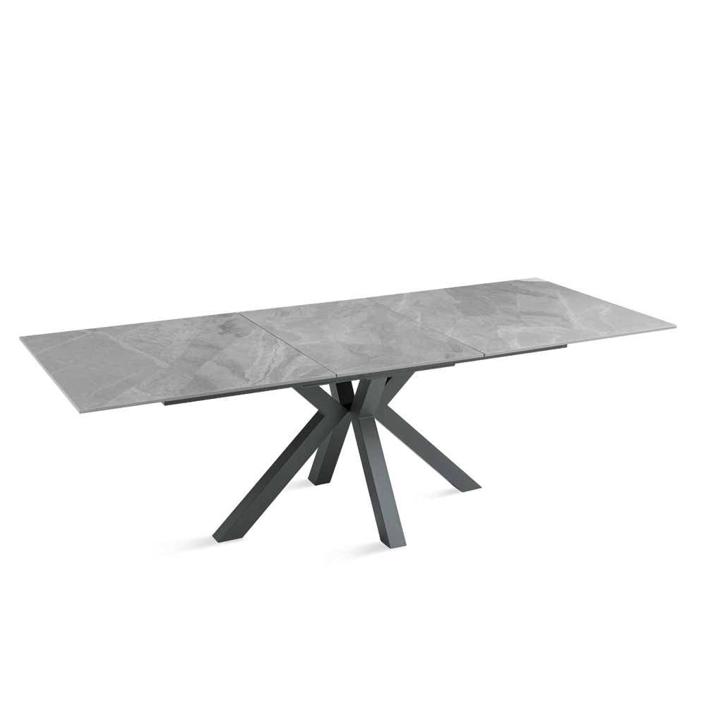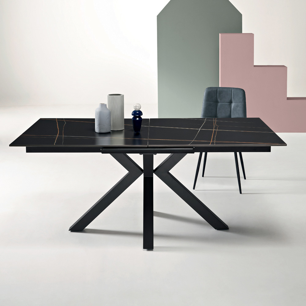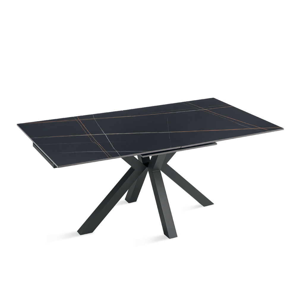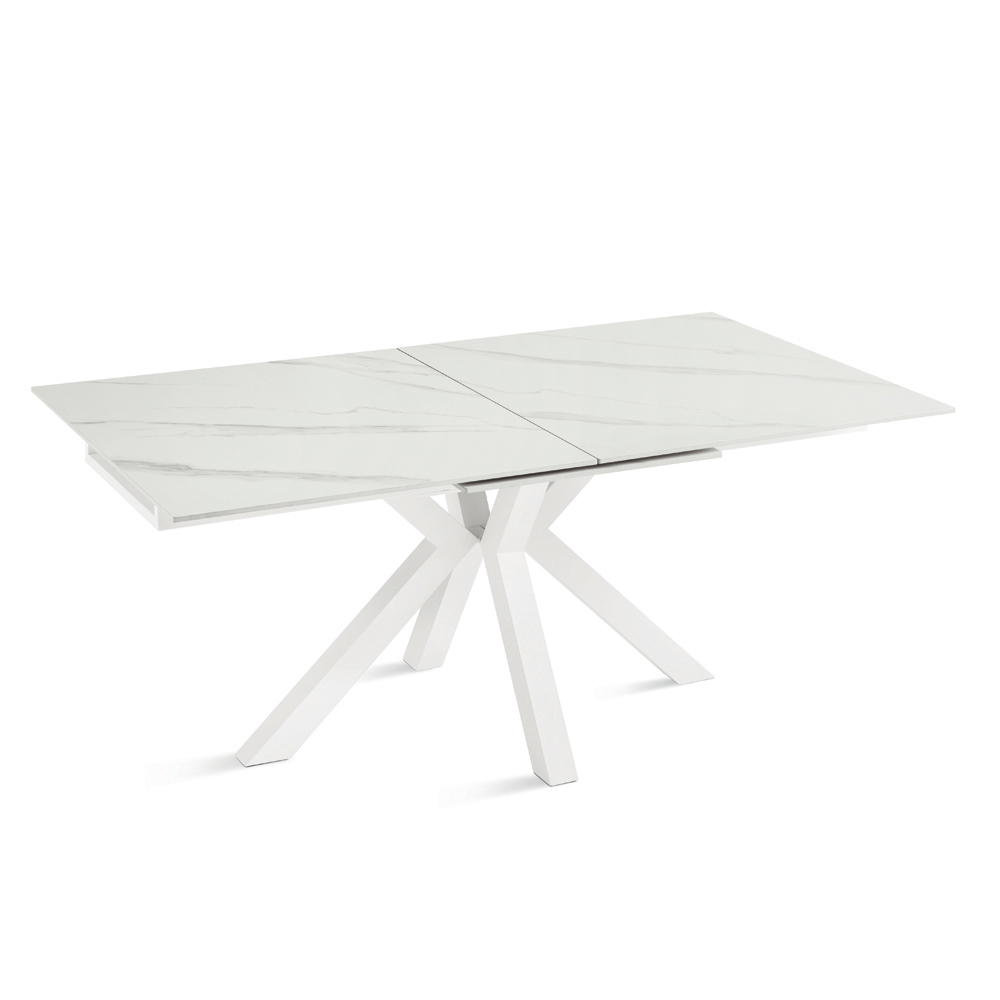 Udtrækkeligt spisebord med et moderne look, perfekt til at forbedre din spisestue eller stue . Den sintrede stenplade med marmorlook kombinerer raffineret æstetik med praktisk anvendelighed, mens den malede metalbund sikrer stabilitet og robusthed.