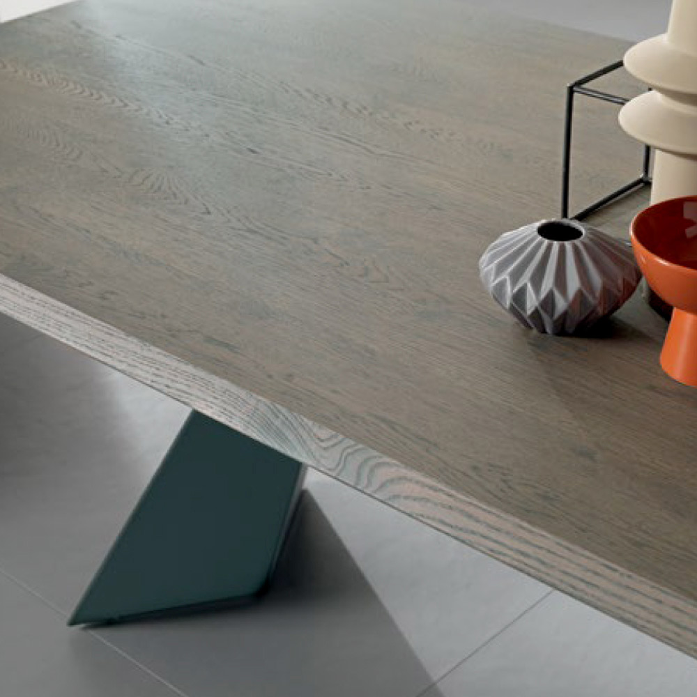 Dette bord kombinerer arkitektonisk kreativitet og moderne elegance og forvandler ethvert rum til et stilfuldt rum . Egetræsfinerpladen udtrykker al den naturlige åretegning , mens den tynde, let skrånende kant giver visuel lethed og et strejf af modernitet.