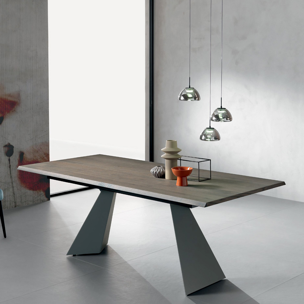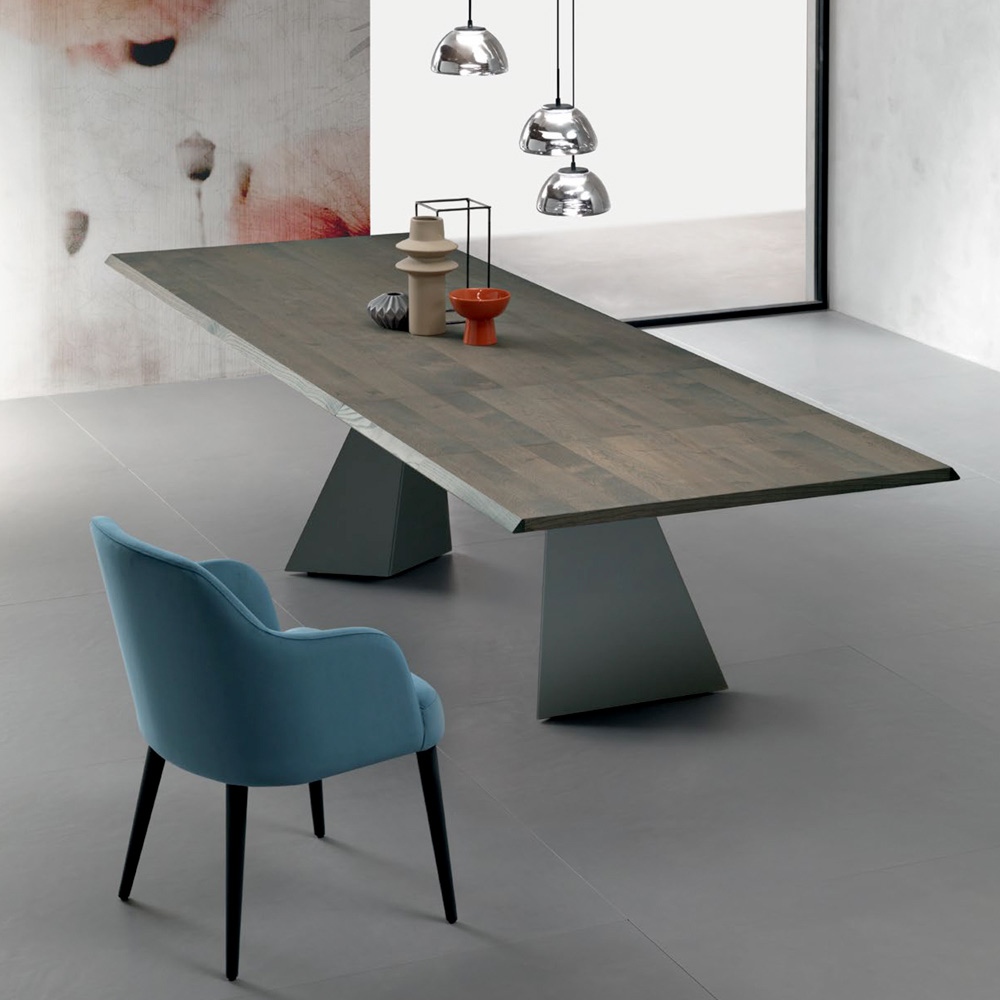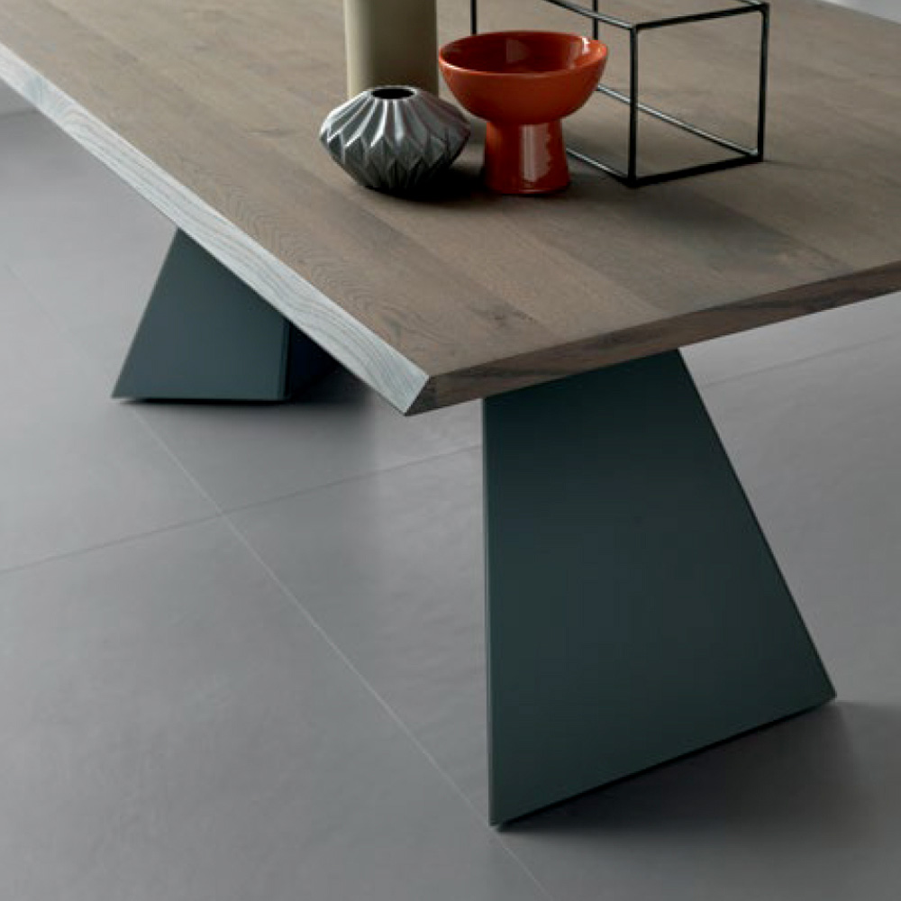 Den skulpturelle antracitfarvede metalbase , der består af to geometriske understøtninger, tilbyder et dristigt design, der sikrer stabilitet og karakter . Kombinationen af træets varme og metallets soliditet skaber en æstetisk upåklagelig balance, perfekt til dem, der søger et designermøbel , der også er funktionelt.