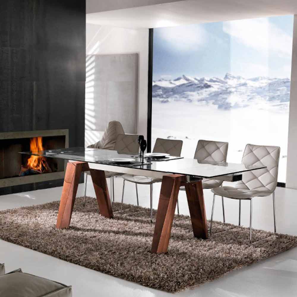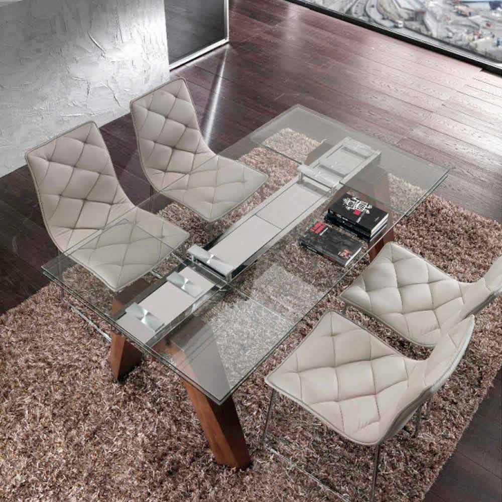 Det moderne udtrækkelige bord Tchad har en gennemsigtig hærdet glasplade og ben i massivt træ.