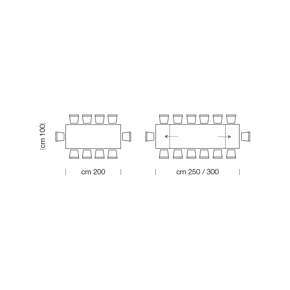 - L 200 (300) x D 100 x H 75,8 cm 14 personers udtrækbar med to udvendige forlængere på hver 50 cm.