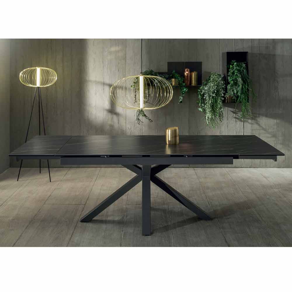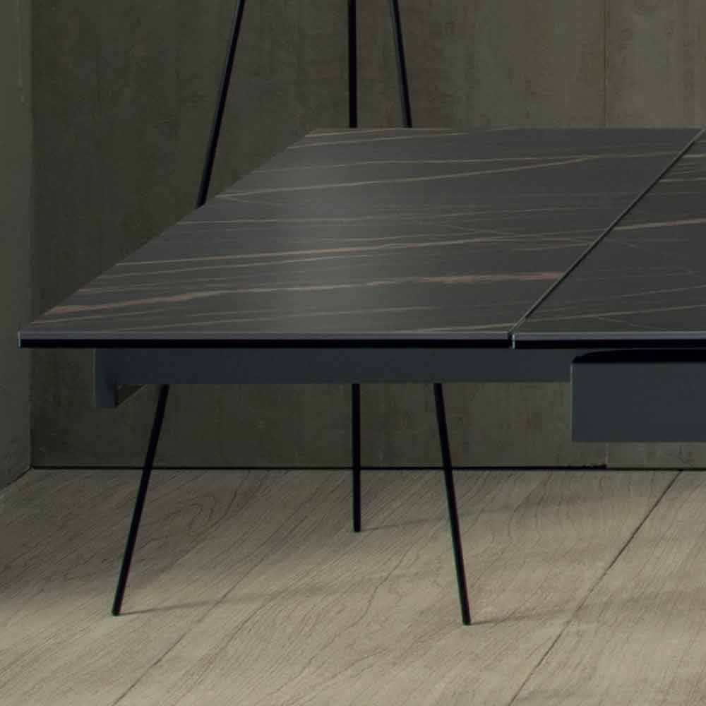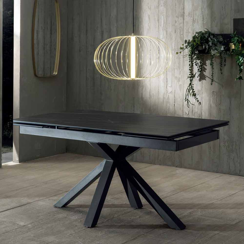 Dette spisebord er kendetegnet ved et elegant design og en stærk visuel indvirkning, der gør det muligt at erobre centrum af opmærksomhed i rummet. Toppen er lavet af 6 mm tyk portoro-effektkeramik, hvorunder et 8 mm tykt glaslag placeres for at give keramikken fleksibilitet, hvorved skader undgås, mens rammen og benene er produceret i mat antracitlakeret metal . Benene repræsenterer et af de grundlæggende punkter, da de giver bevægelse og et vidunderligt unikt design til bordet og hele rummet, hvor det er placeret. Det, der adskiller dette vidunderlige spisebord, er utvivlsomt muligheden for at udvide toppen op til en længde på 240 cm takket være de 2 40 cm forlængelser i samme finish som toppen og placeret under den. Takket være den valgte kombination af materialer og finish er denne artikel den perfekte løsning til indretning af miljøer præget af en moderne og raffineret stil, der kræver et bord, der kan give rummet personlighed ved at kombinere skønhed og elegance uden at forsømme det grundlæggende praktiske og funktionelle aspekt . .