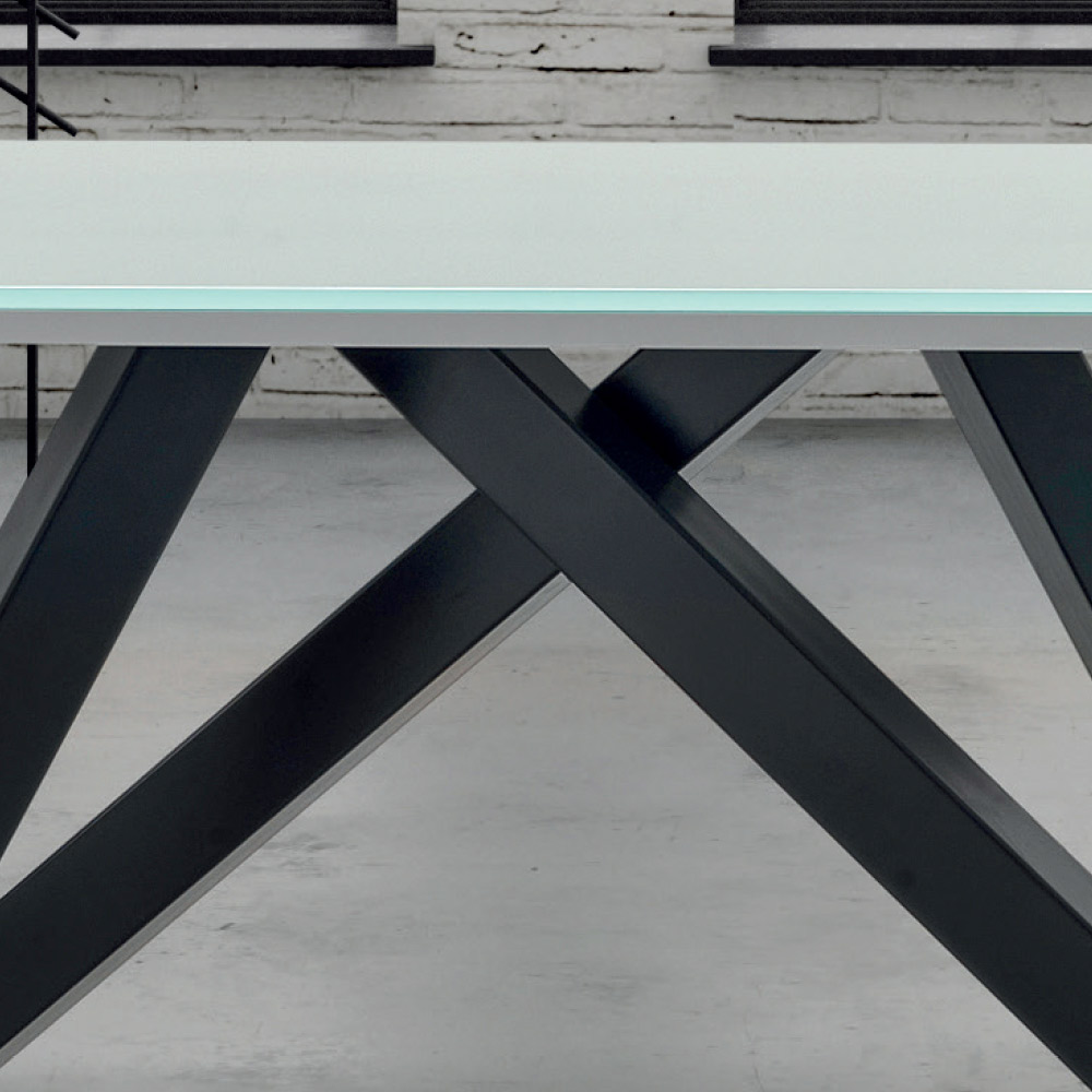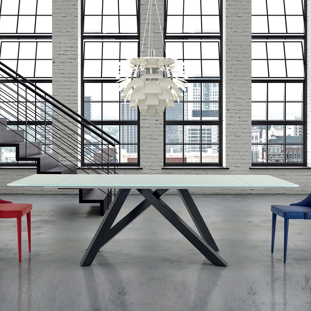 Udtrækkeligt køkkenbord op til 278 cm med glasplade og sort stålfod fremstillet i Italien.