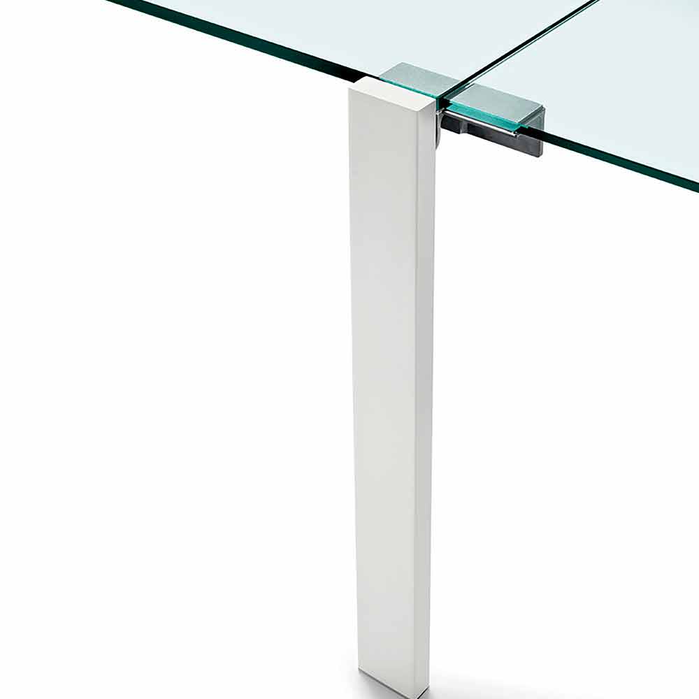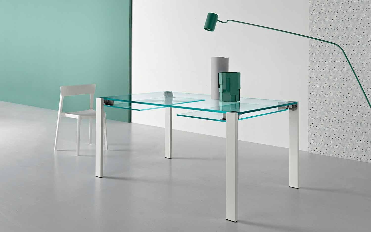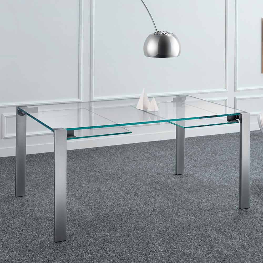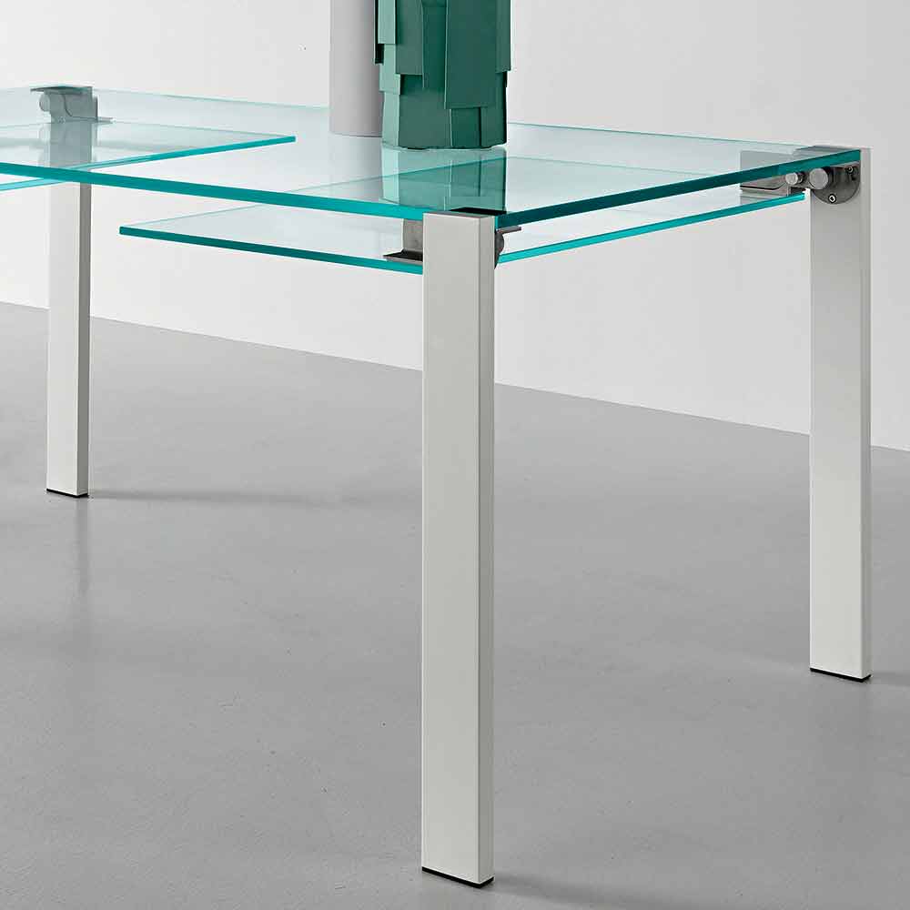 Ekstra klart glasbord, der kan udvides op til 280 cm med forkromet eller hvidmalet metalbund, fremstillet i Italien.