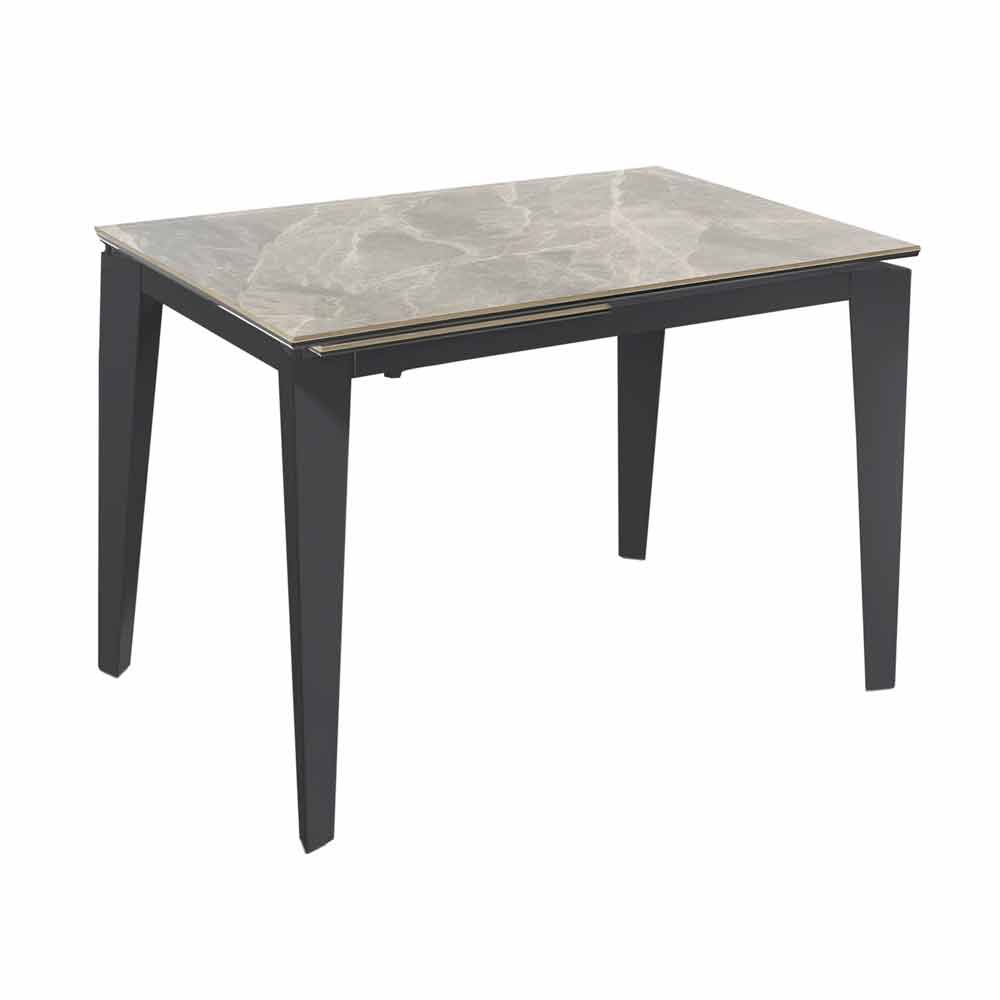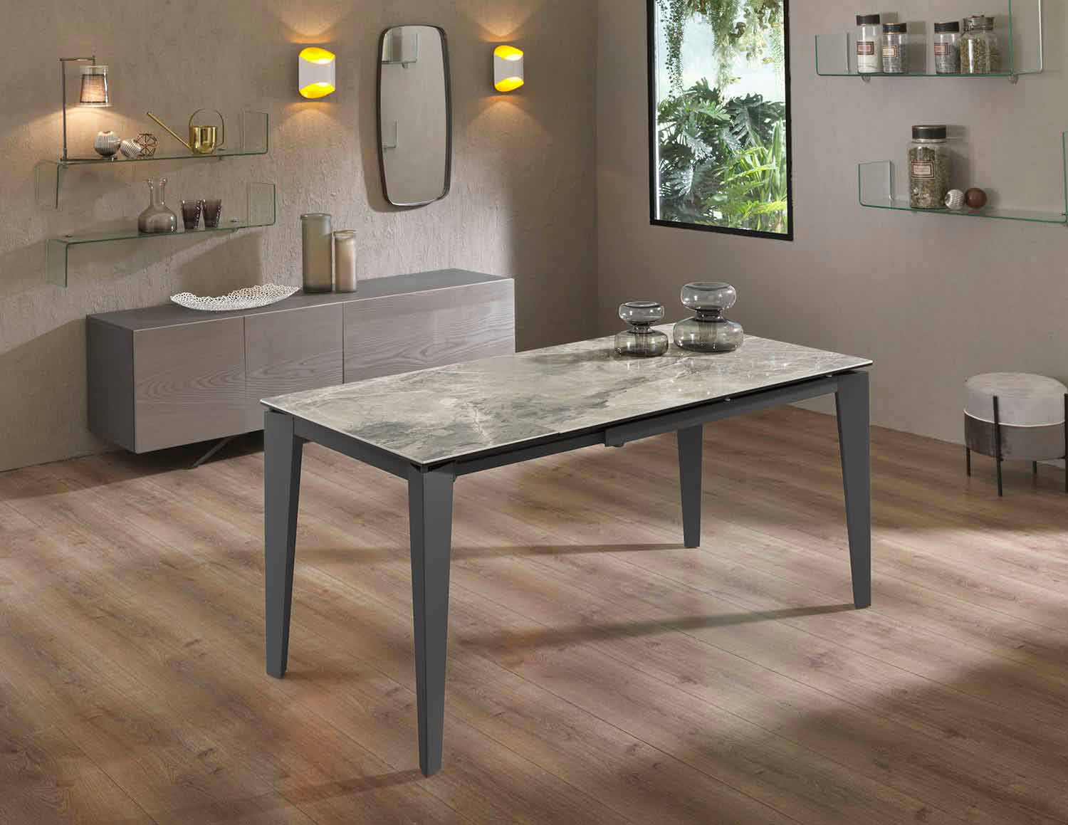 Syrta er et rektangulært spisebord, der er kendetegnet ved muligheden for at blive forlænget op til 170 cm for om nødvendigt at få mere plads ved bordet og dermed større komfort, ideel til at være vært for venner og familie uden at ofre komfort. Bordet er lavet med en malet metalstruktur og keramikplade på antracitfarvet hærdet glas, der gør bordet elegant og modstandsdygtigt på samme tid og er også komplet med indvendige forlængelser, også keramik på hvidt glas.