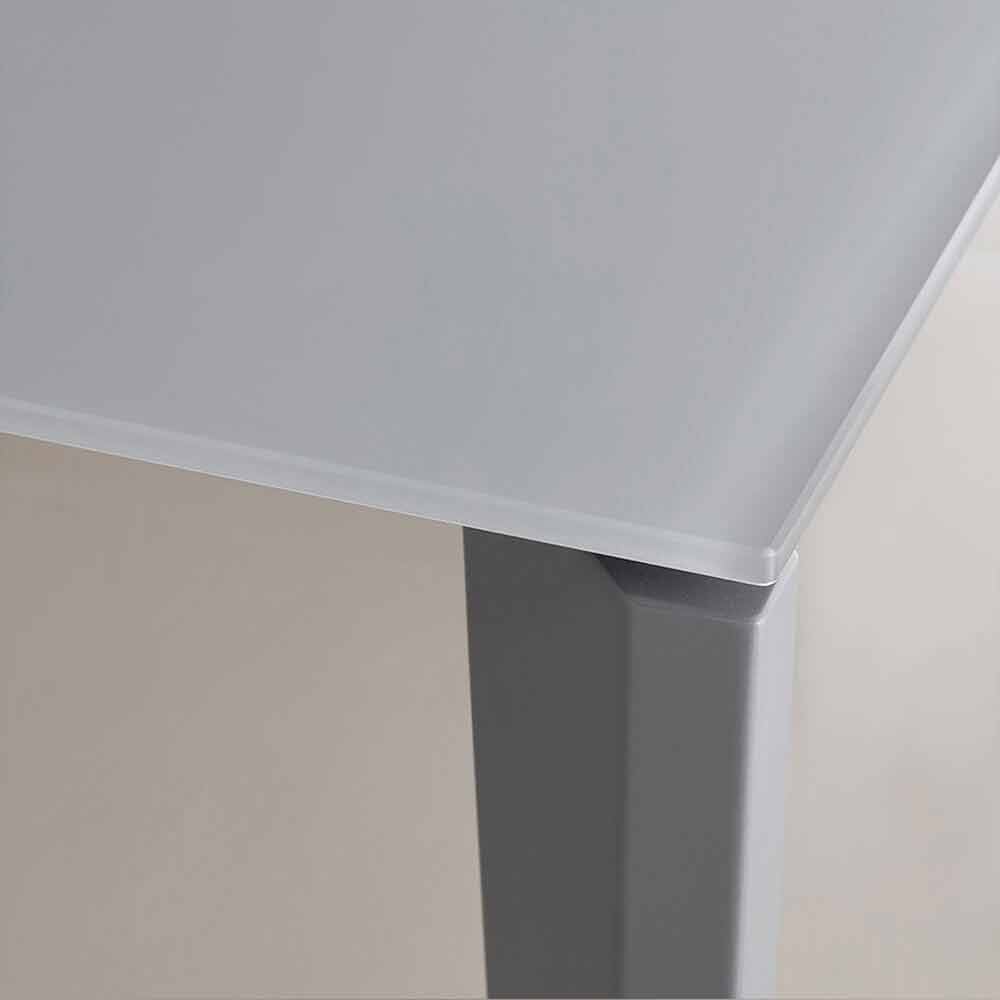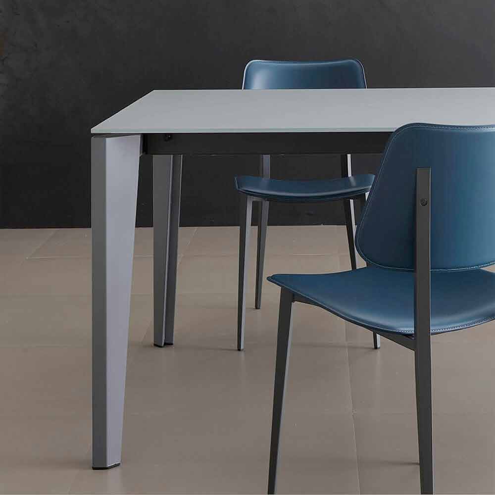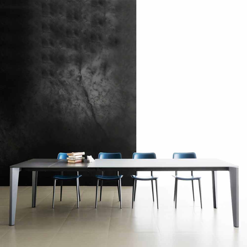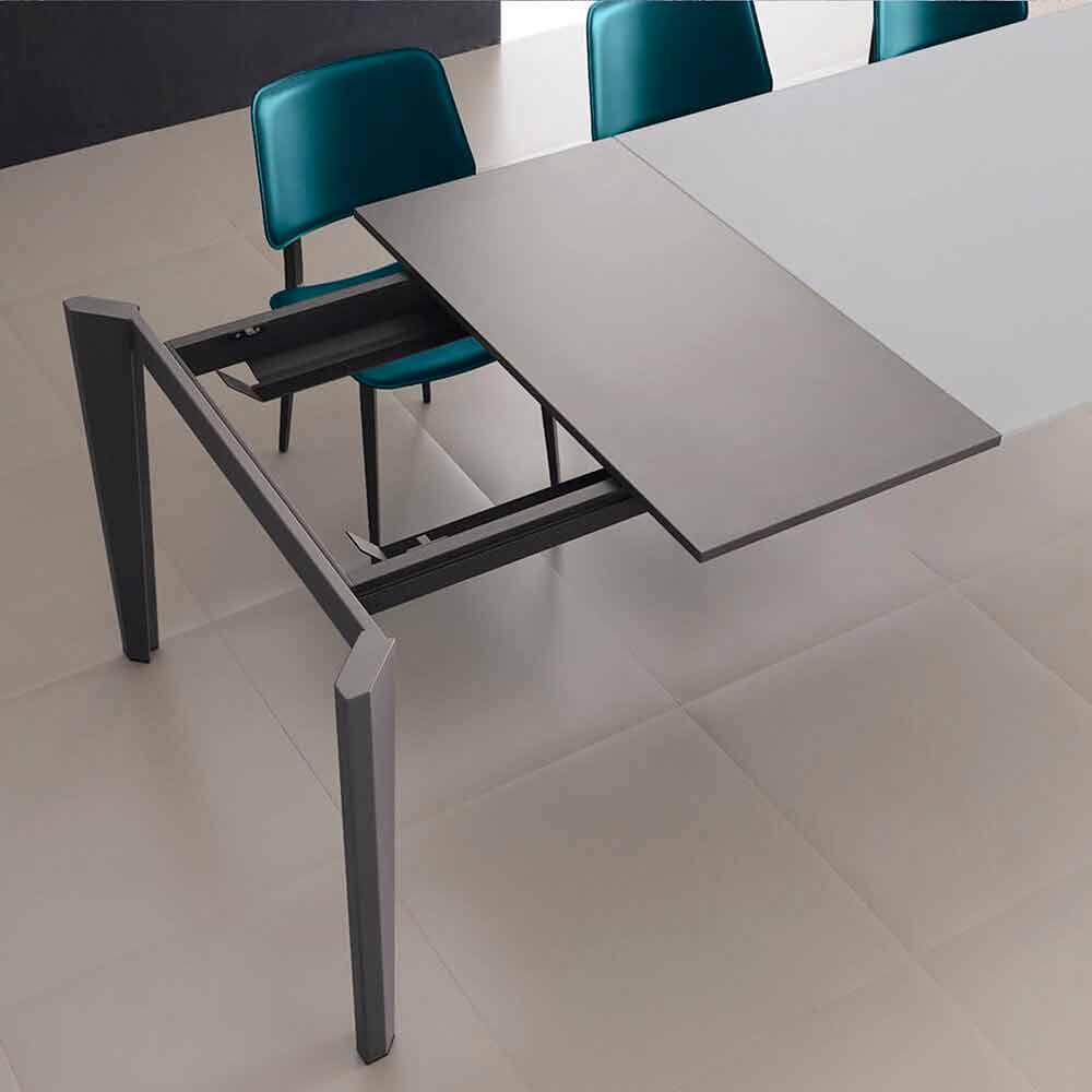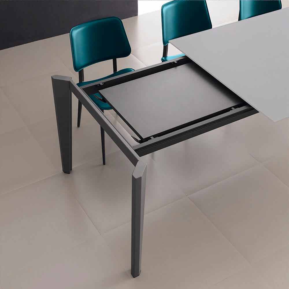 Spisebord fremstillet i Italien med udtrækkelig top i anti-fingeraftryk satinglas (10 mm tyk) med pulverlakering, forlængelse i antracit melamin og base i antracitlakeret metal .