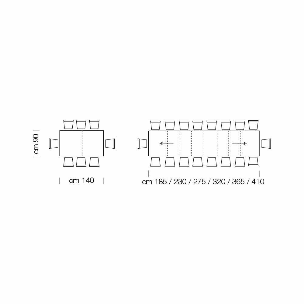 - L 140 (410) x D 90 x H 75,3 cm 18 sæder, der kan forlænges med tre indvendige forlængere på hver 45 cm og tre udvendige forlængere på hver 45 cm;
