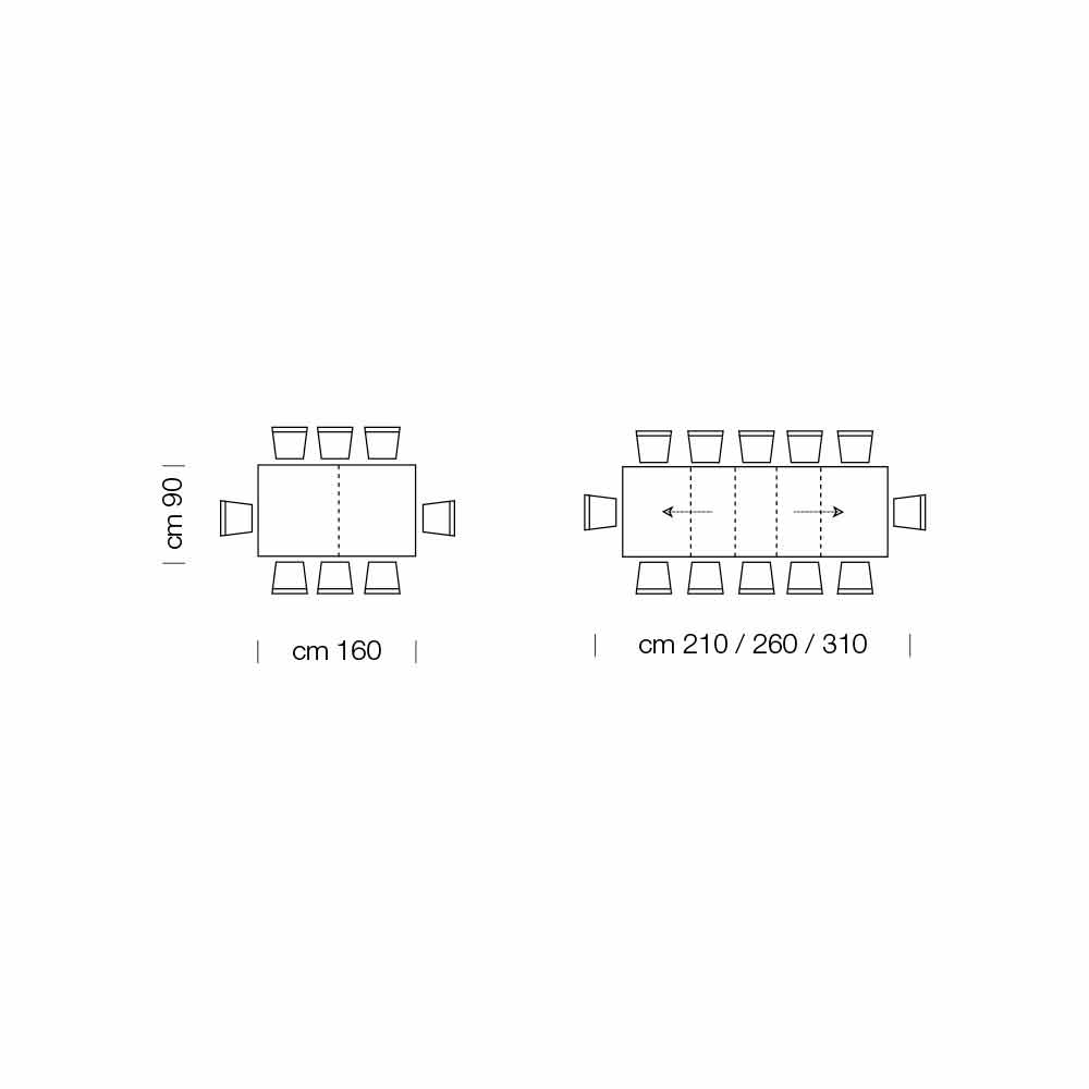 - L 160 (310) x D 90 x H 75,3 cm 12 personers forlængelse med tre indvendige forlængere på hver 50 cm;