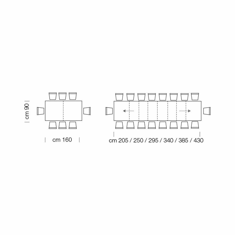 - L 160 (430) x D 90 x H 75,3 cm 18 sæder, der kan forlænges med tre indvendige forlængere på hver 45 cm og tre udvendige forlængere på hver 45 cm;