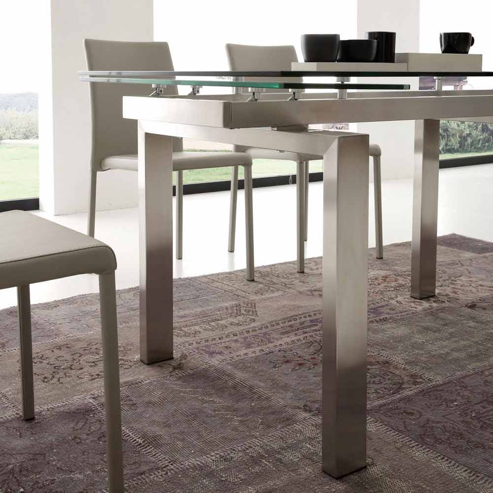 Moderne spisebord med stel af børstet rustfrit stål og gennemsigtig hærdet glasplade (10 mm).