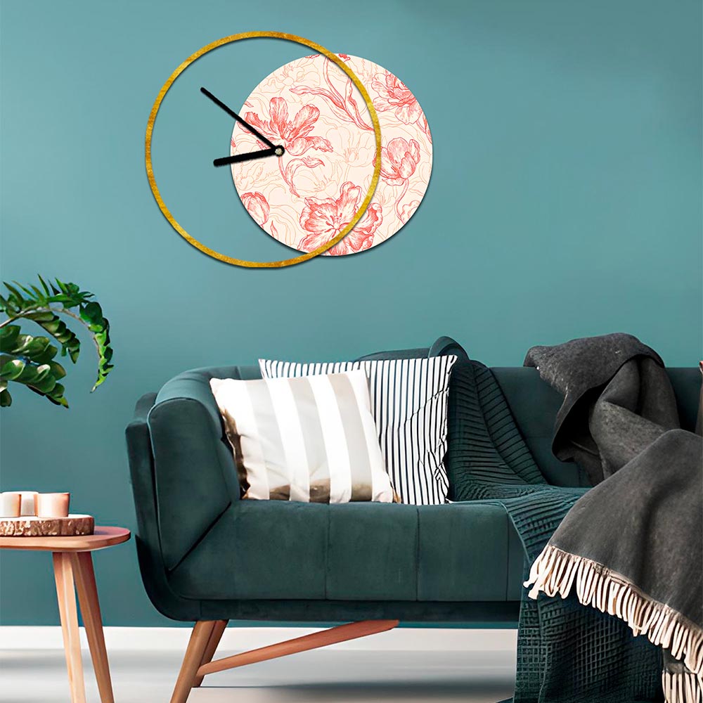 - bladguld ur og print med grene og blomster i nuancer af pink/okre