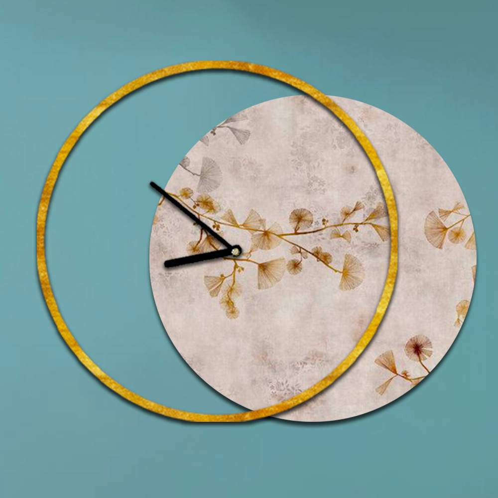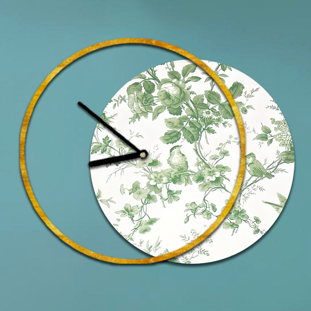 - bladguld ur og print med grene og fugle i grønne nuancer
