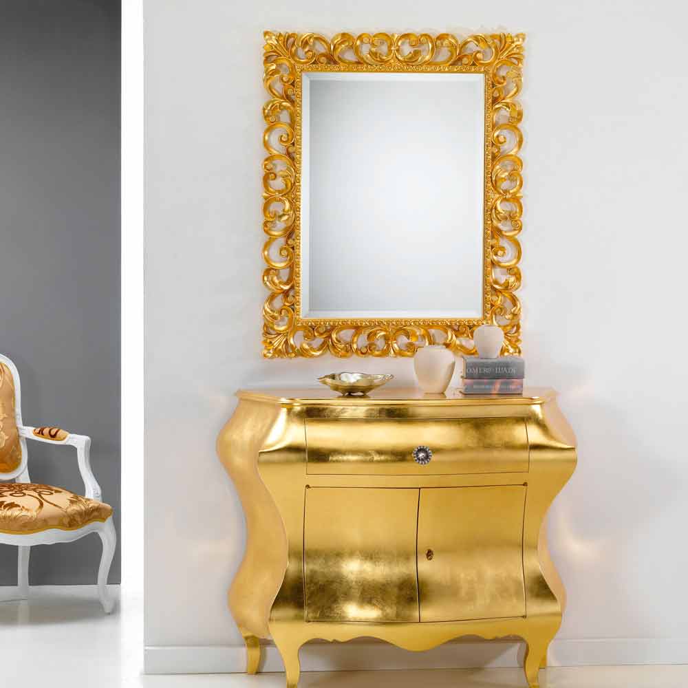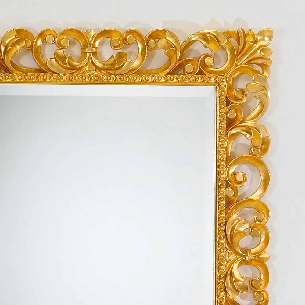 Spejlet Paris er kendetegnet ved en håndværksmæssig udført ved anvendelse materialer af høj kvalitet og brug oplevelsen af faglærte italienske håndværkere. Rammen er lavet af træ dekoreret med udskæringer. bladguld finish. Spejl med affasede glas, 4mm tykt. Made in Italy. At hænge enten lodret eller vandret.